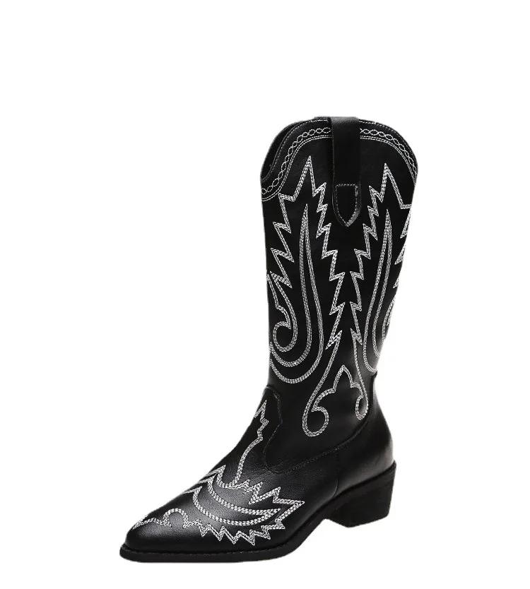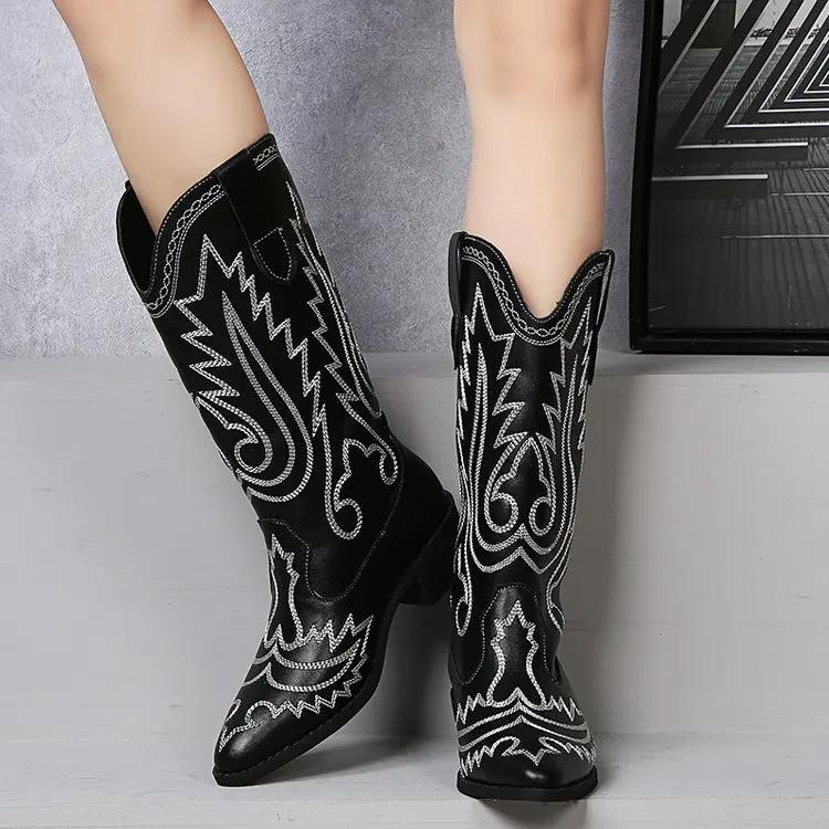 Женские модные вышитые ковбойские сапоги в стиле вестерн, универсальные сапоги на толстом каблуке и высоком каблуке, остроносые рыцарские сапоги на осень