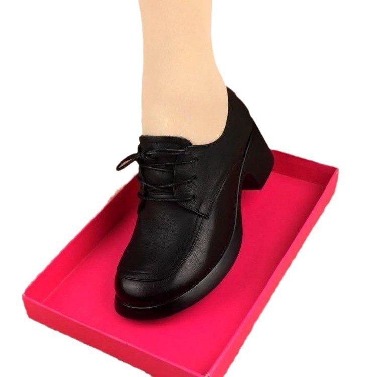 Одинарные туфли женские 2024 осень новые модные универсальные туфли на шнуровке с круглым носком толстый каблук средний каблук британский стиль мама маленькие кожаные туфли