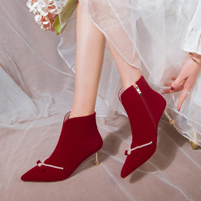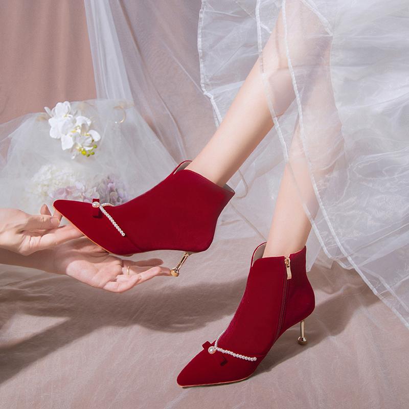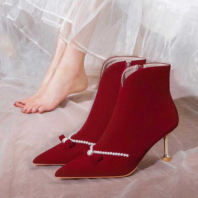 Красный бархат шоу одежда невесты зимняя обувь сапоги на высоком каблуке новые свадебные туфли тонкие каблуки свадебные сапоги 2024 короткие сапоги женские года