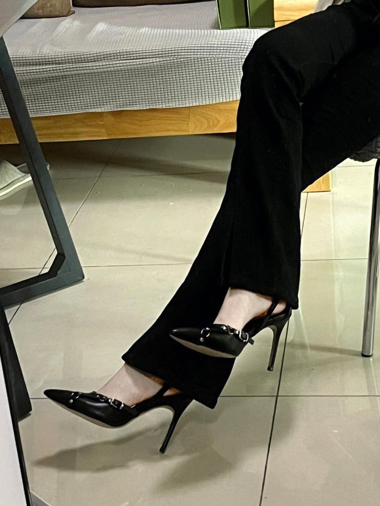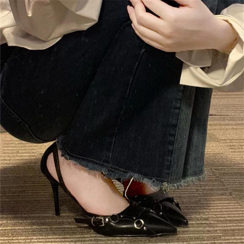 Черные туфли на высоком каблуке с заклепками, женские туфли-стилеты 2025 года, новые, сексуальные, большого размера, одно слово с острыми полыми туфлями