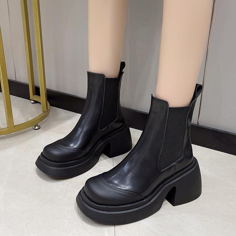 Модный тренд черный британский стиль толстый каблук толстая подошва ботинки Мартина женские 2025 новые весна и осень увеличивающие рост и стройнящие короткие ботинки