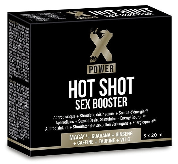 L'aphrodisiaque Hot Shot Sex Booster de la gamme XPower est un complément alimentaire sous forme de shot de 20 ml pour les hommes qui souhaitent augmenter la libido et intensifier leurs relations sexuelles. Son petit format le rend facilement transportable lors de toutes occasions afin de booster votre sexualité de manière rapide. Fabrication 100% françaiseLa maca est une plante naturelle qui aide à stimuler le désir sexuel et est une source d'énergie. Le ginseng aide à la vitalité et favorise les performances physiques. Le guarana aide à se sentir plus énergique et à réduire la fatigue mentale. Conseil d'utilisation : Boire 1 flacon shot (= 20 ml) par jour, 1h avant l'effet souhaité.Volume net : 60 ml soit 3 shots de 20 ml. Ingrédients : Eau, Stabilisant: Glycérol, Fructose, Extrait de Maca (Lepidium meyenii-racine), Extrait de Guarana (Paullinia cupana-graine) dont Caféine, Acidifiant: Acide Citrique L-Carnitine, L-Arginine, Poudre de jus d'Acérola (Malpighia glabra-fruit) dont Vitamine C, Taurine, Extrait de Gingembre (Zingiber officinale-rhizome), Arôme Orange, Arôme naturel Citron, Extrait de Ginseng (Panax Ginseng Meyer-racine), Conservateurs: Sorbate de Potassium, Benzoate de Sodium, Antioxydant : Acide Ascorbique, Vitamine B3, Vitamine B5 (D-pantothénate de Calcium ), Vitamine B12 (Cyanocobalamine ), Vitamine B6 (Chlorhydrate de Pyridoxine), Vitamine B2 (Riboflavine). Information nutritionnelle pour 20 ml : Extrait de Maca (Lepidium meyenii) : 380 mg Extrait de Guarana (Paullinia cupana) : 364 mg dont Caféine : 80 mg L-Carnitine : 200 mg L-Arginine : 200 mg Acérola (Malpighia glabra) : 160 mg dont Vitamine C : 40 mg (50% AR*) Taurine : 150 mg Extrait de Gingembre (Zingiber officinale) : 100 mg Extrait de Ginseng (Panax Ginseng Meyer) : 60 mg Vitamine B3 (Nicotinamide) : 16 mg (100% AR*) Vitamine B5 (D-pantothénate de calcium) : 6 mg -(100% AR*) Vitamine B12 (Cyanocobalamine) : 2,5 µg (100% AR*) Vitamine B6 (Chlorhydrate de pyridoxine) : 1,4 mg (100% AR*) Vitamine B2 (Riboflavine) : 1,4 mg (100% AR*) Apports de Référence. Mention obligatoire d'avertissement : Complément alimentaire, ne peut se substituer à une alimentation variée et équilibrée. A prendre dans le cadre d'un mode de vie sain. Tenir hors de portée des enfants. Ne pas dépasser la dose journalière recommandée. Produit réservé à l'adulte. Contient de la caféine (80 mg/20 ml), déconseillé aux enfants, adolescents, femmes enceintes ou allaitantes ainsi qu'aux personnes sous traitement antidiabétique. Éviter de consommer des boissons contenant de la caféine. Une consommation excessive peut avoir des effets laxatifs. A conserver dans un endroit sec et à l'abri de la lumière. Bien agiter le flacon avant emploi. A consommer rapidement après ouverture. La présence d'un léger dépôt n'altère pas la qualité du produit.
