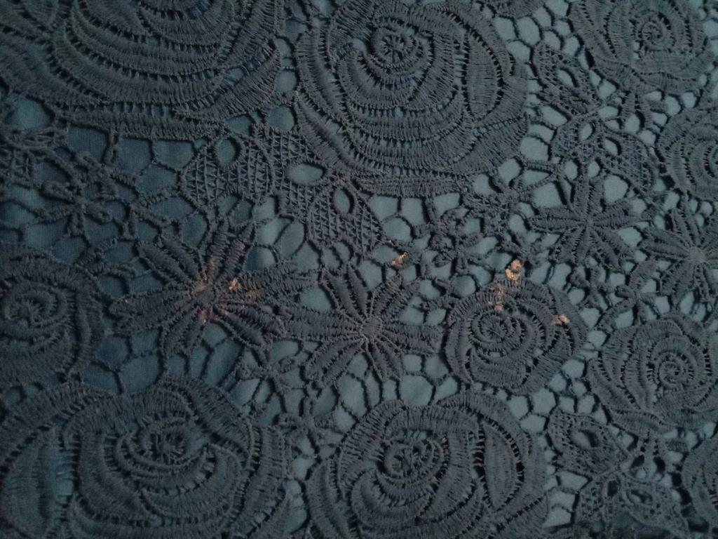На первый взгляд - красота, и размер подошёл. Но при ближайшем рассмотрении проявилась ложка дёгтя: стразы и бусины приляпаны как попало, в центр цветочков и завитушек в основном не попадают, одна стразина уже отсутствует. На рукавах в трёх местах на сеточке остатки клея (похоже, по крайней мере, на клей). Совсем чуть-чуть, в двух местах удалось убрать, в одном пока не получается, благо, на не очень видном месте.