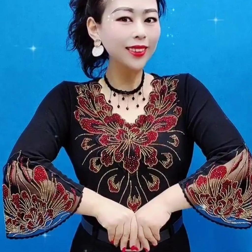 Элегантная женская кружевная футболка с расклешенными рукавами и ромбами, весна-лето, большой размер, модные, тонкие, универсальные, винтажные, с V-образным вырезом, графические топы