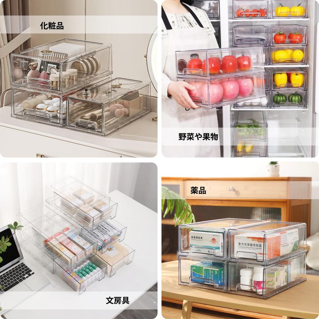 [Практичность и Удобство] Прозрачные ящики практичны. Материал - пищевой ПЭТ-материал, который обладает хорошей изоляцией, коррозионной стойкостью и высокой прозрачностью.. Кроме того, прозрачные ящики обладают большой вместимостью и штабелируемой конструкцией, что позволяет хранить различные мелкие предметы и делает жилое пространство более чистым и упорядоченным.