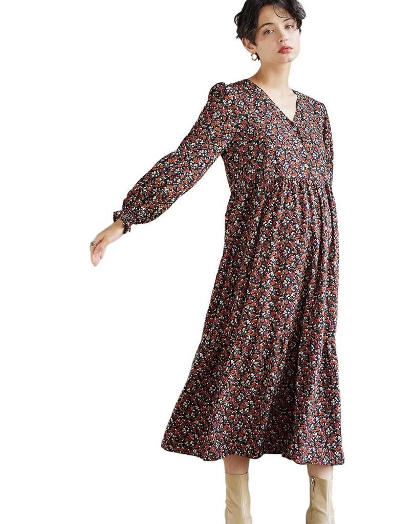 Платье для беременных объемное многоярусное с цветочным принтом длинное V-образный вырез черное с цветочным принтом 10131202 [ANGELIEBE] Платье, Рукава, Подол, Узор, Платье, Дородовое, Послеродовое, На подкладке, Рукав, Вырез,