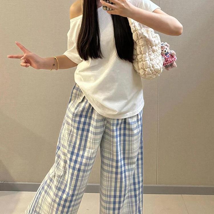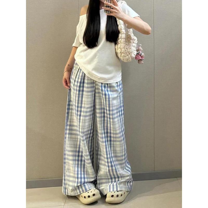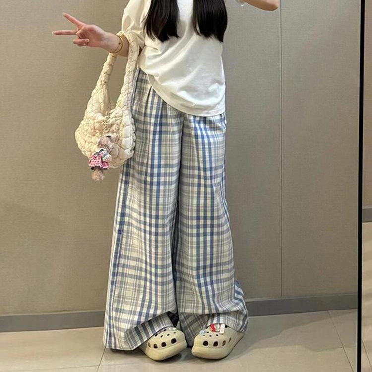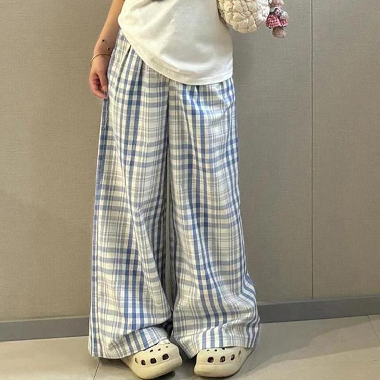 Синие клетчатые повседневные брюки для женщин на весну и лето, свободные и универсальные широкие прямые брюки в пол