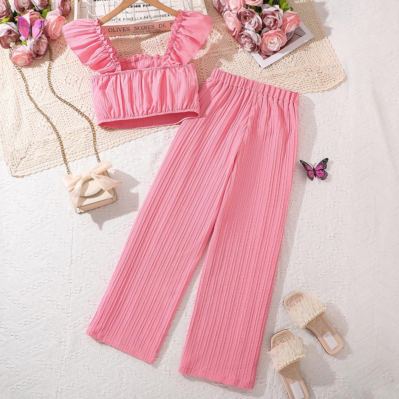 Костюмы для девочек Детская одежда Летние топы на бретельках для больших детей Прямые брюки с эластичной резинкой на талии Повседневный костюм из двух частей