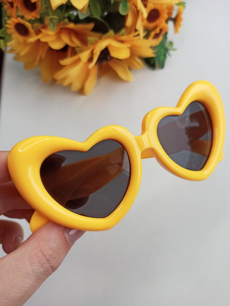 Детские солнцезащитные очки в форме сердечек На выбор у продавца предоставлены в разных цветах. Очки выполнены из плотного пластика, прочные. Все сделана качественно: дужки закреплены плотно. Сами же очки лёгкие. Очки полностью соответствуют фотографиям и описанию продавца. Смотрятся симпатично. Вывод: очки хорошие, рекомендую 👍