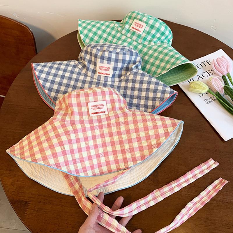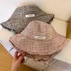 Корейская двухсторонняя клетчатая шляпа рыбака, женская шляпа-ведро с ремешком, шляпа для отдыха на открытом воздухе, солнцезащитная шляпа