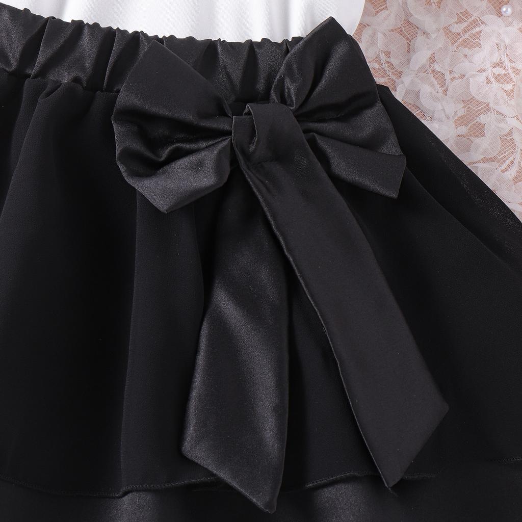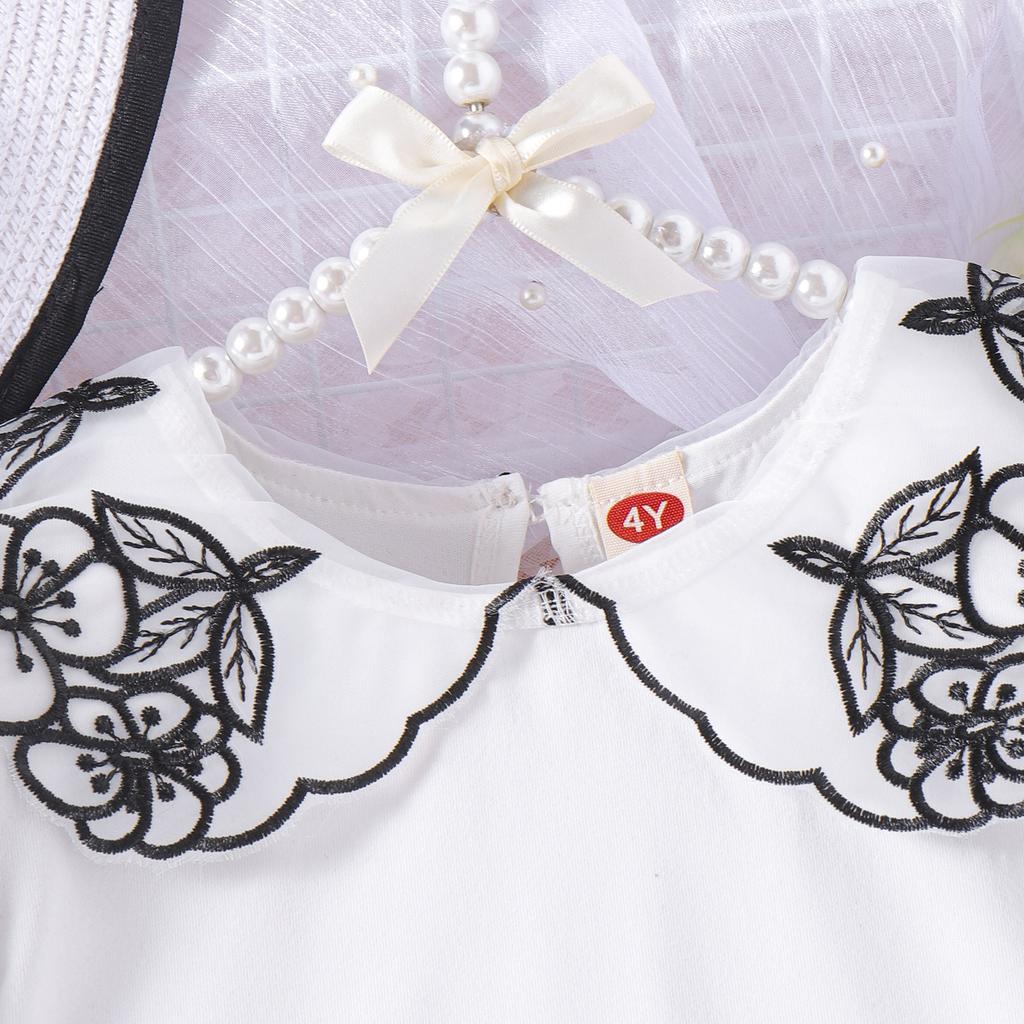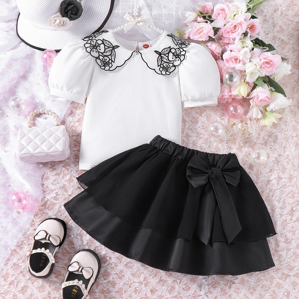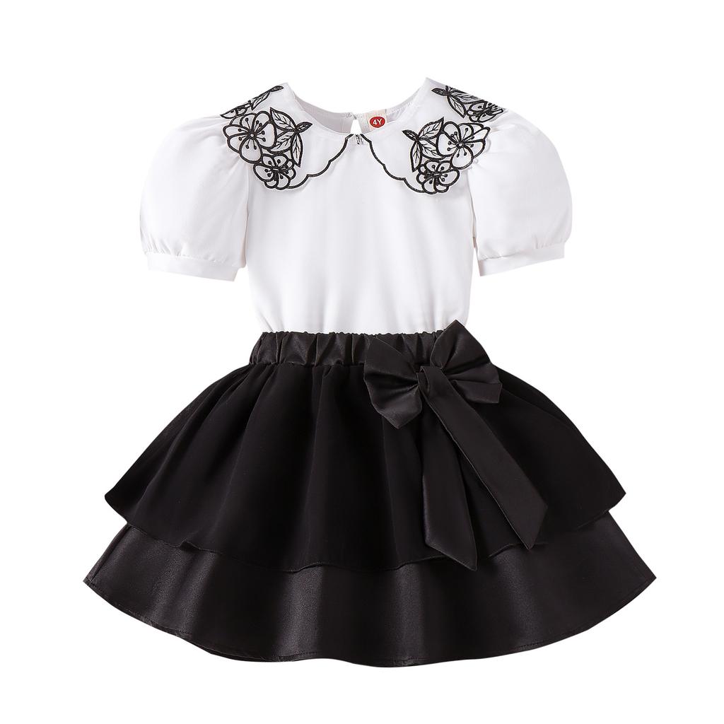 Летний костюм для девочек, детский костюм из двух частей, с воротником-куколкой, цветочной вышивкой и короткими рукавами, с бантом и короткой юбкой