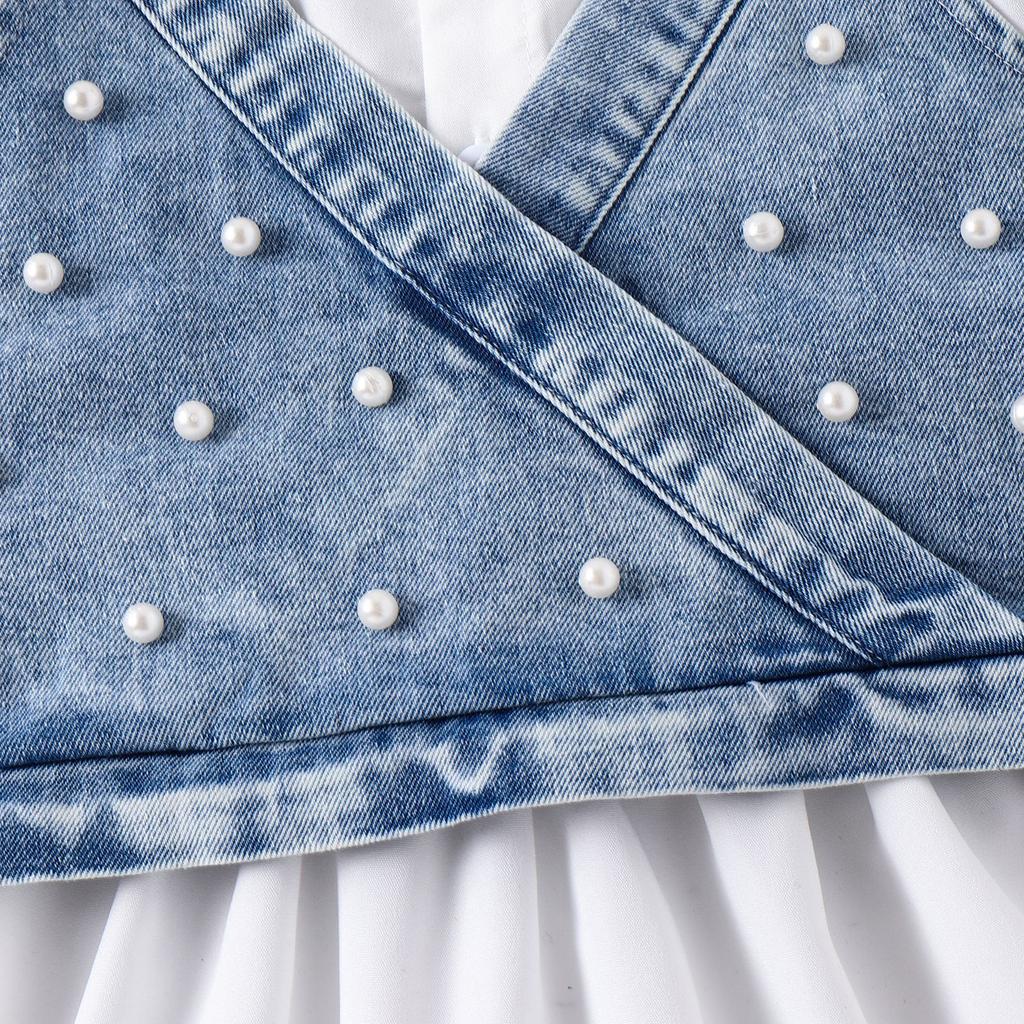 Летнее детское платье-рубашка с короткими рукавами и лацканами, джинсовый жилет с жемчугом, костюм для девочек