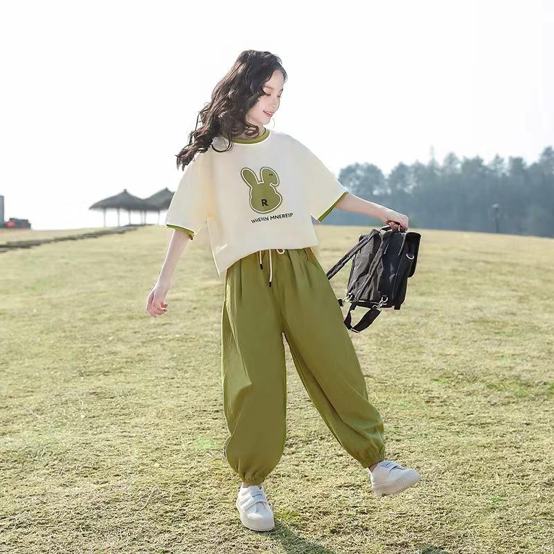 Летний детский комплект одежды для девочек, спортивный костюм, футболка с буквами + зеленые спортивные штаны с завязками на щиколотках, для детей и подростков