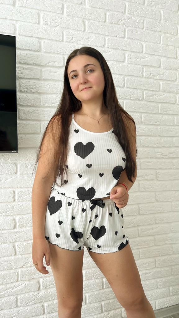 🌺Пижамка. 🌺Комплект: шортики и маечка. 🌺Тонкая, отлично тянется, приятна к телу. 🌺Эта пижамка станет идеальным выбором для комфортного отдыха дома. Она сшита из мягкого, приятного на ощупь материала. Каждый элемент продуман для максимального удобства. Топ имеет аккуратный вырез, а шорты обеспечивают свободу движения. Дизайн украшен милыми сердечками, что добавляет уют и теплоту образу. 🌺 Этот комплект прекрасно сохраняет форму даже после многочисленных стирок, уже стирала несколько раз. Сочетает стиль и практичность, подходит как для сна, так и для времяпрепровождения в кругу семьи или друзей👍😘😘😘
