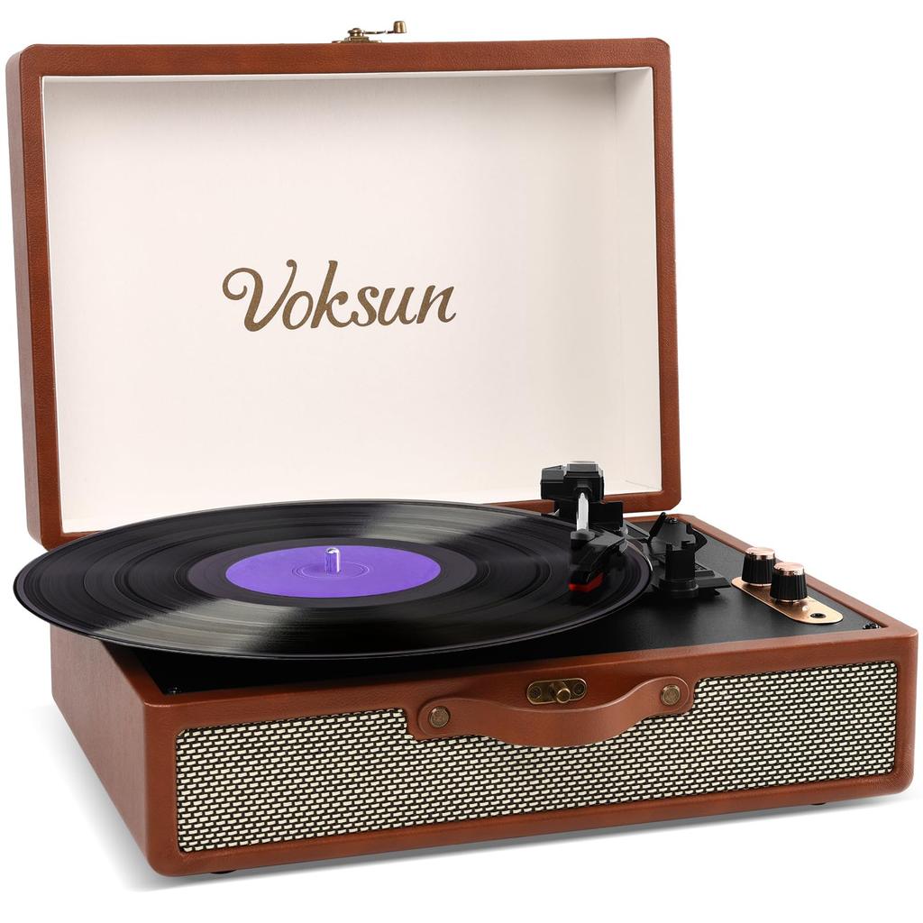 [Хорошее качество звука/Улучшенное пропуск звука] Встроенные стереодинамики обеспечивают высококачественный, чистый звук. Специальная резонансная конструкция обеспечивает надлежащий контакт между пластинкой и иглой пластинки, а также улучшает пропуск звука.. *Тот факт, что проигрыватель плавает, является нормальной ситуацией. Он установлен для гашения вибраций и не является неисправностью. Это проигрыватель с ретро-дизайном из коричневой кожи. Изысканный дизайн под камень придает ему роскошный вид.