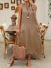 Элегантное однотонное бежевое цельное платье без рукавов средней длины для женщин с круглыми карманами на завязках, подходит для лета