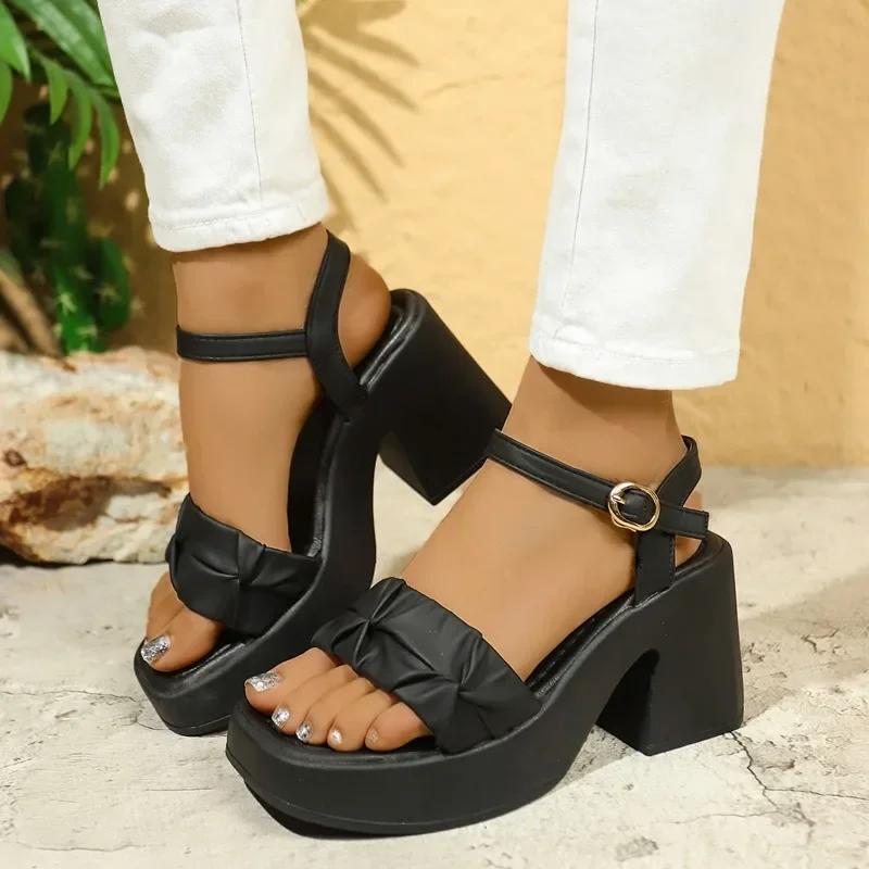 Женская обувь Новые туфли с открытым носком Платье Женские сандалии Большой размер Узкий ремешок Плиссированные Сандалии на каблуке Женские Массивный каблук