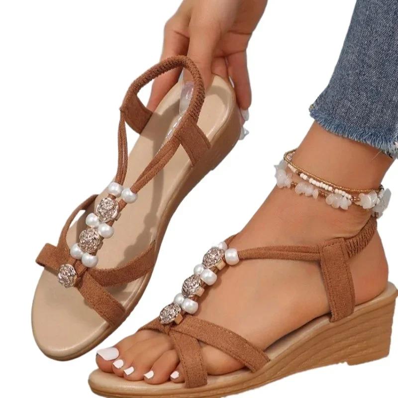 Женская обувь 2025 Лето Эластичная лента Женские сандалии Уличные Женские Повседневные Бусины на шнурке Круглый носок Большой размер Платформа Клиновидный сандалий