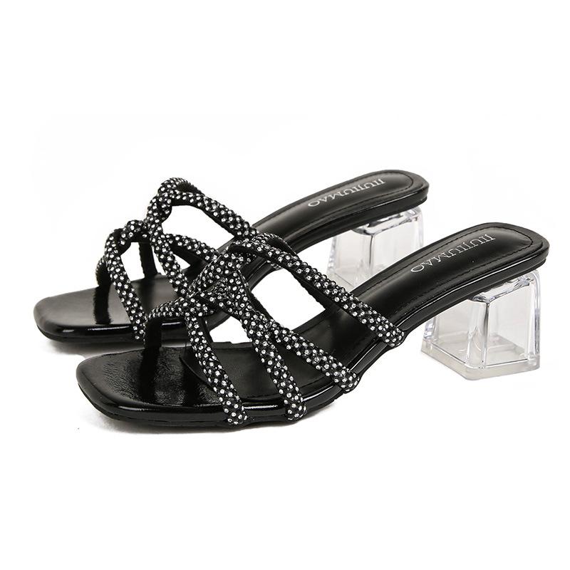 2025 spring and summer new rhinestone thin belt transparent crystal thick heel European and American square head fashion cool heels, versatile ou