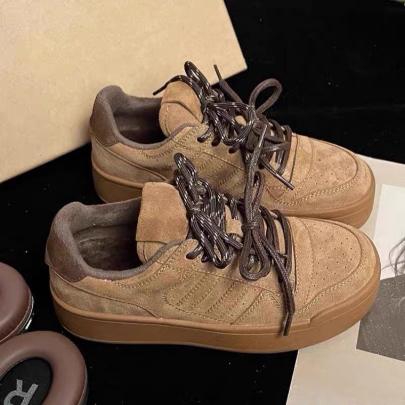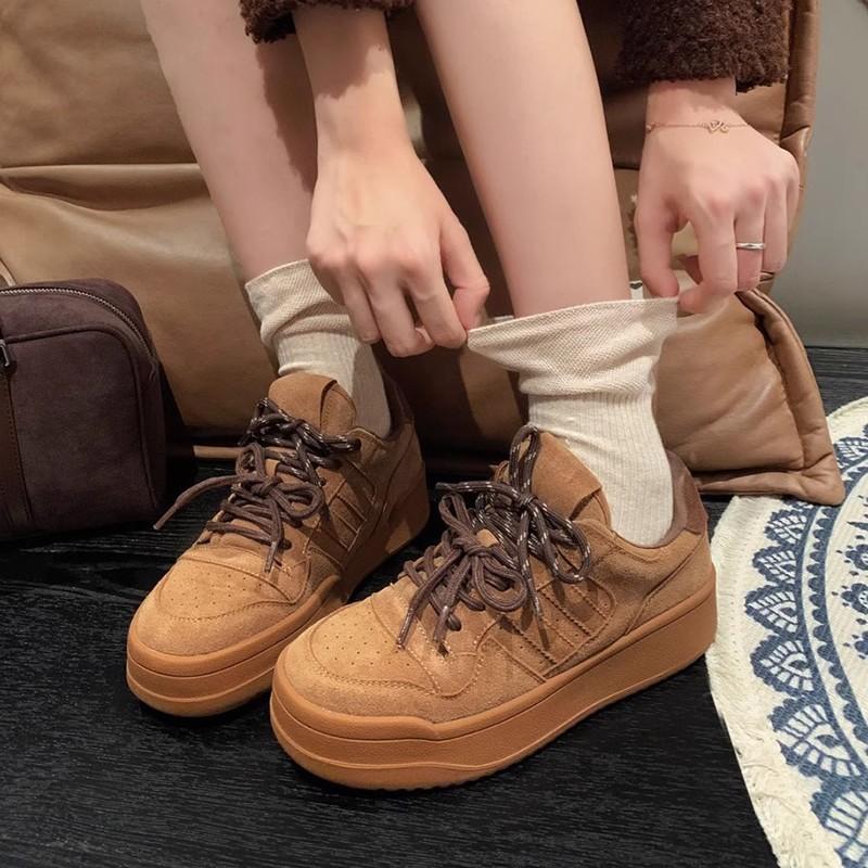 Корейская версия модных белых туфель на платформе женские 2024 новые ретро универсальные бархатные с круглым носком на шнуровке повседневные спортивные туфли