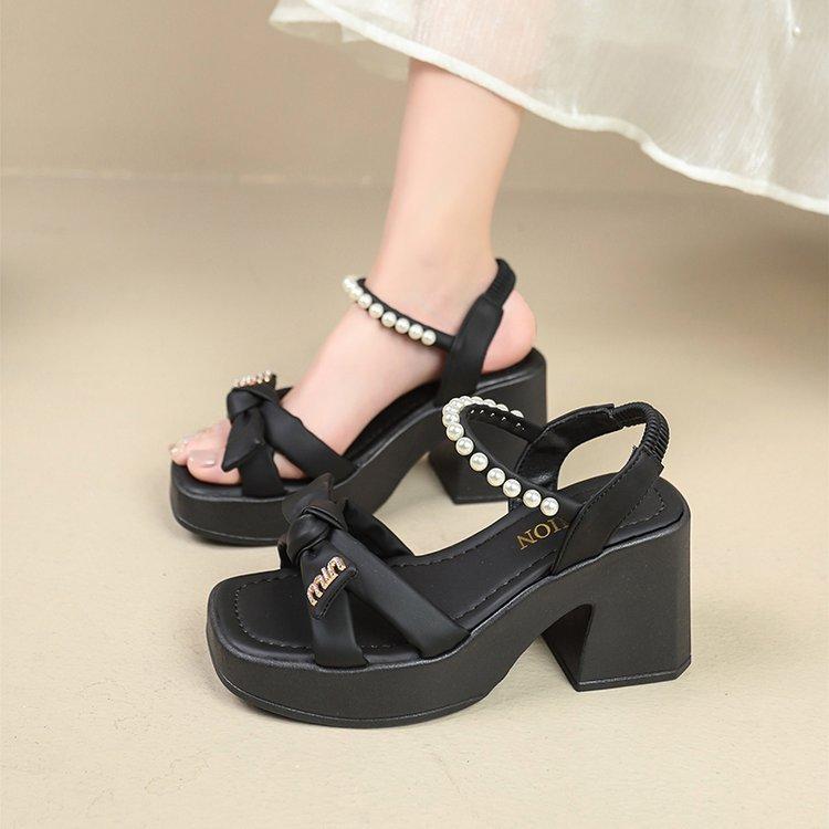 Французские туфли на высоком каблуке, толстый каблук, лето 2025, новые нежные туфли с бантом, жемчужные босоножки на платформе с одним словом и пряжкой, женские