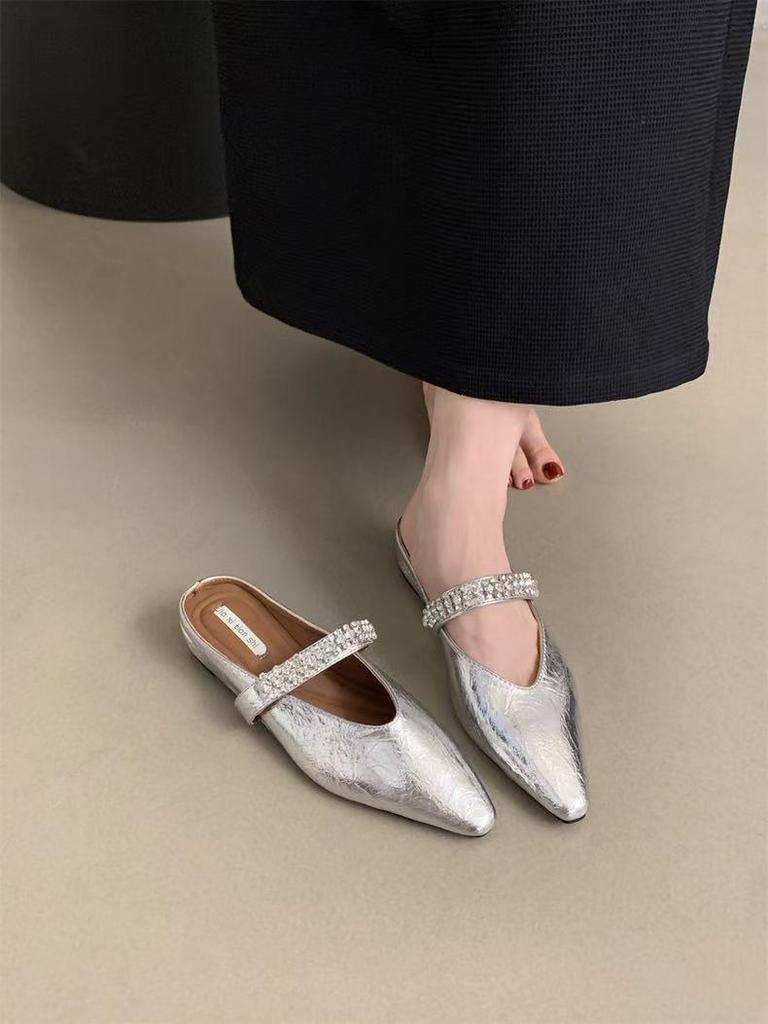 Полуплоская подошва весна 2025 новые европейские красивые женские тапочки носить квадратную головку стразами сзади пустые сандалии