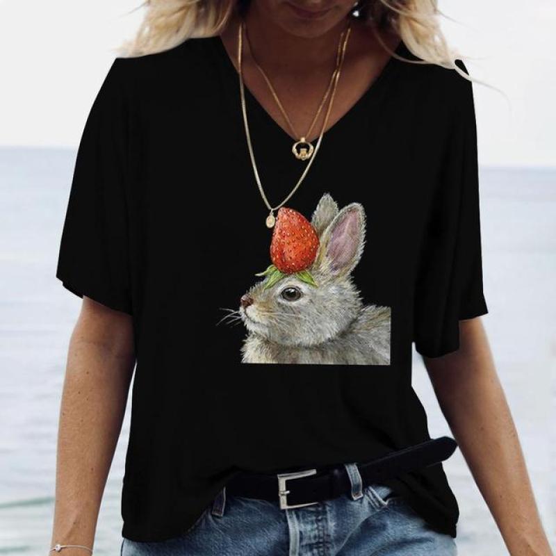 Женская летняя футболка с животным принтом, повседневные футболки с короткими рукавами и кроликом, женская одежда больших размеров с v-образным вырезом, модный пуловер