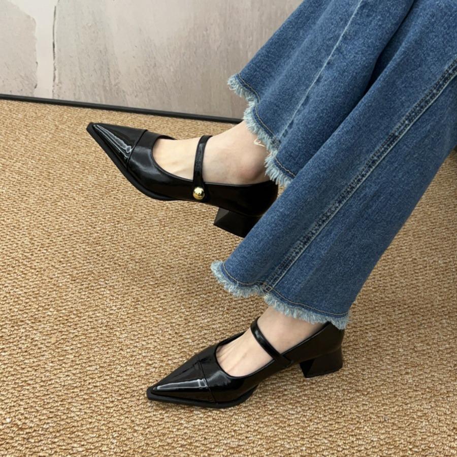 Французские черные туфли Мэри Джейн на толстом каблуке женская обувь новая весенняя остроносая с открытым верхом на высоком каблуке для работы — купить товар онлайн с бесплатной доставкой по всему миру!