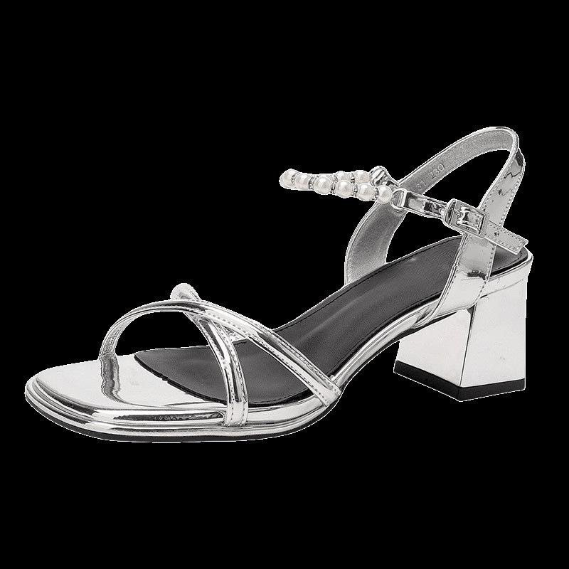 Серебристые босоножки высокого класса женские на толстом каблуке, лето 2024, новые туфли с жемчужной пряжкой в одно слово, с открытым носком, на высоком каблуке, женские туфли на среднем каблуке