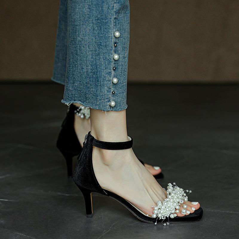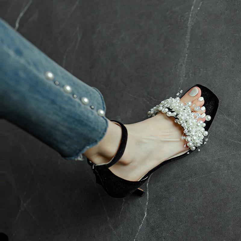 Ручная работа~ Супер красивая самоудерживающаяся~ Босоножки с жемчугом в сказочном стиле, сексуальные, на тонком каблуке, с пряжкой из одного слова, женские, летние
