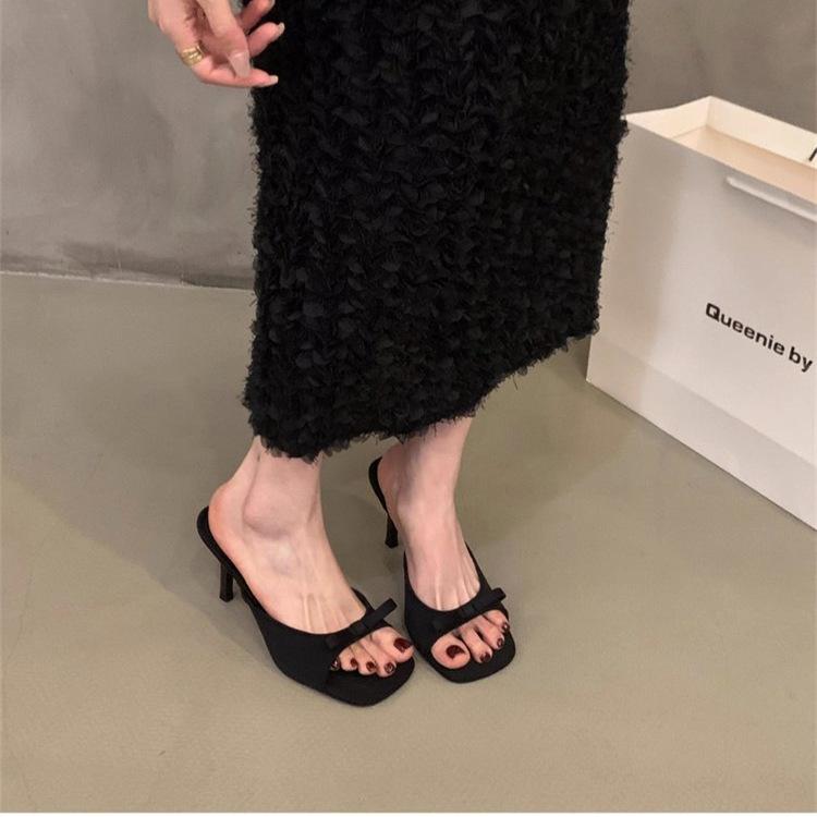 Тапочки женские носят черный бант весной и летом 2025 года атласные рыбки с открытым носком и босоножки на шпильках с высоким каблуком