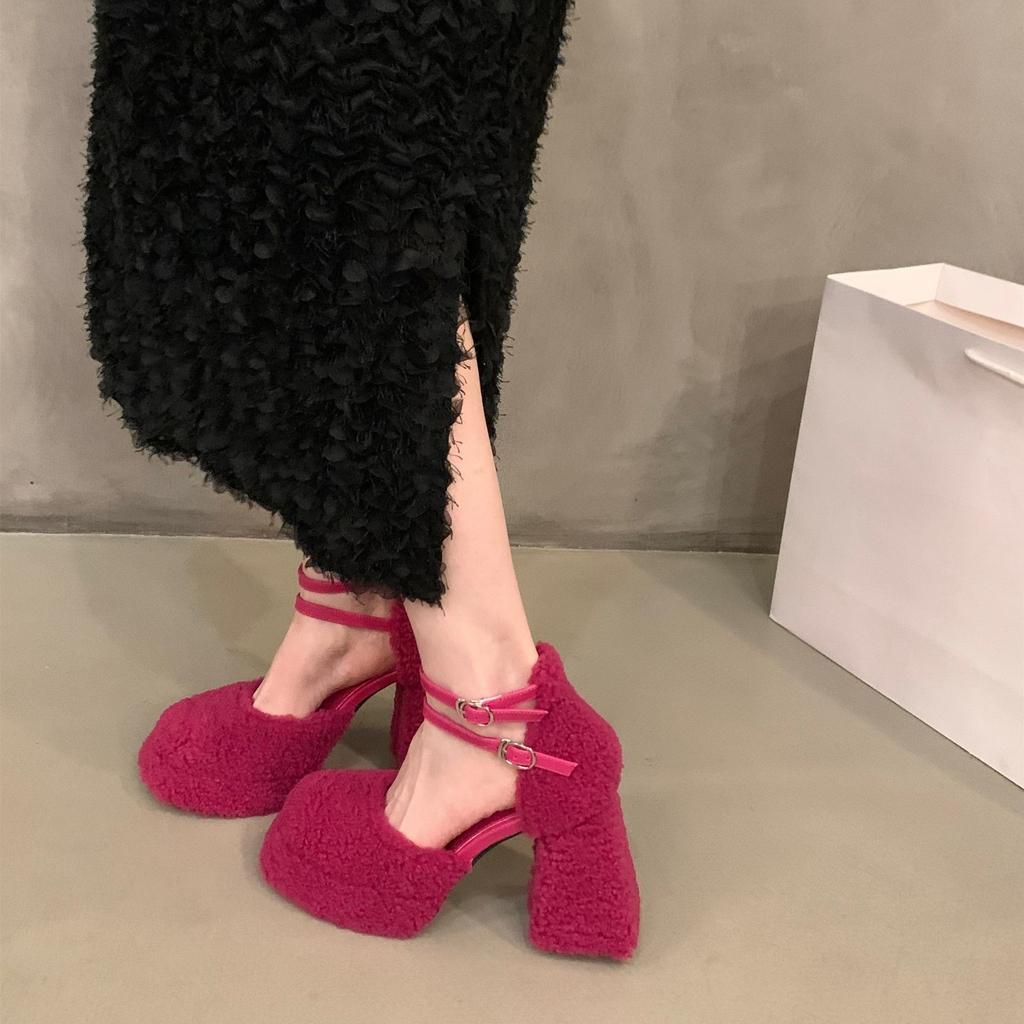 Туфли Мэри Джейн в стиле Spice Girl на очень высоком каблуке, женская обувь 2024 года, новая весна, осень и зима, пушистая обувь на маленьком толстом каблуке