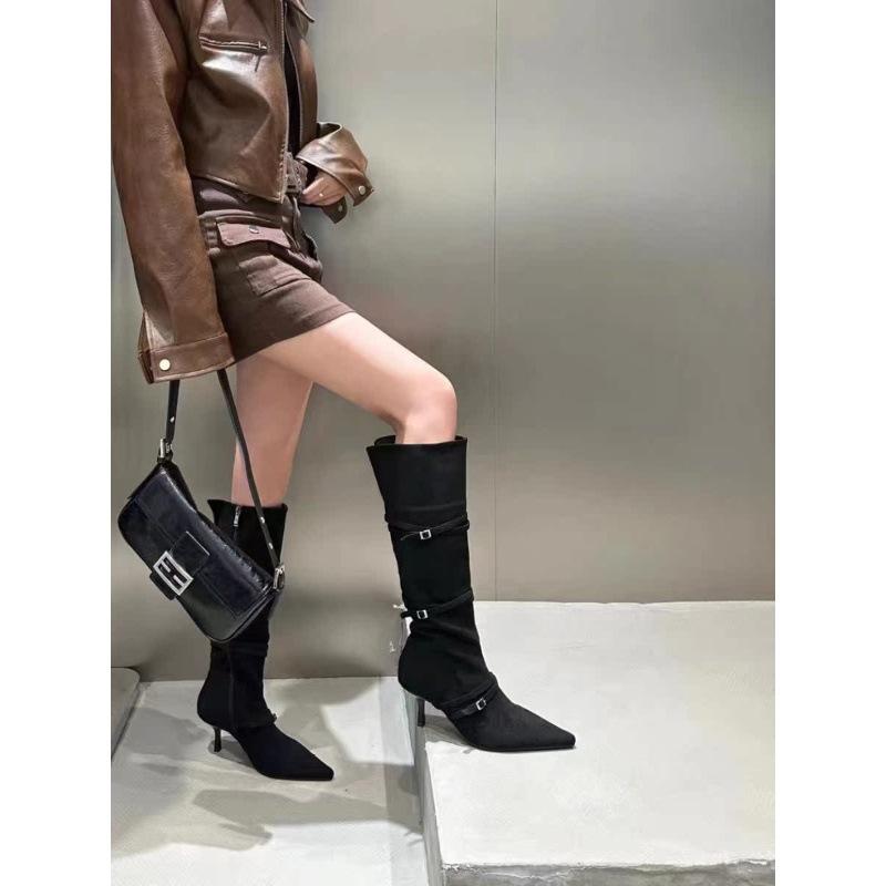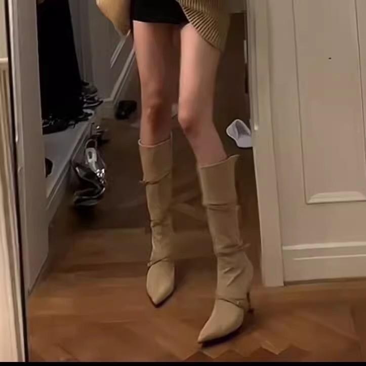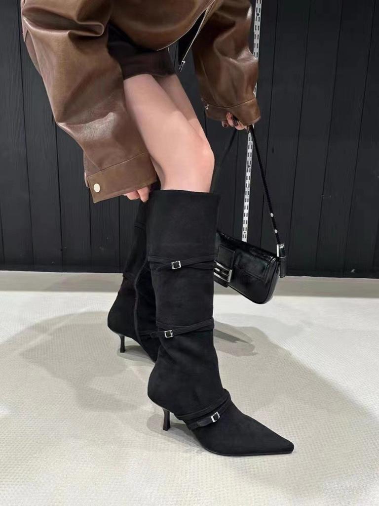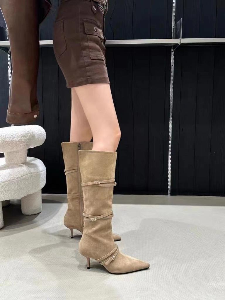 Сапоги женские узкие замшевые узкие каблуки с острым носком сапоги на высоком каблуке до колена узкие сапоги