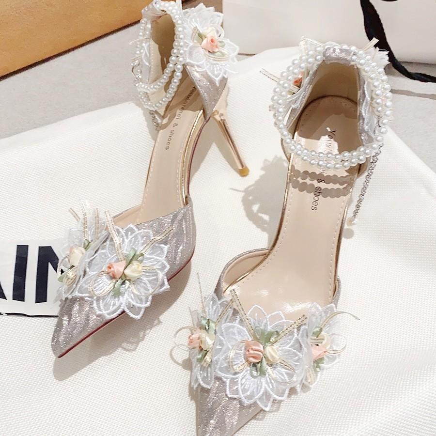 Туфли на высоком каблуке с пряжкой из одного слова, женские, весна и осень 2024, новые, 18-летние, свадебные туфли с серебряным украшением и кристаллами, свадебная обувь