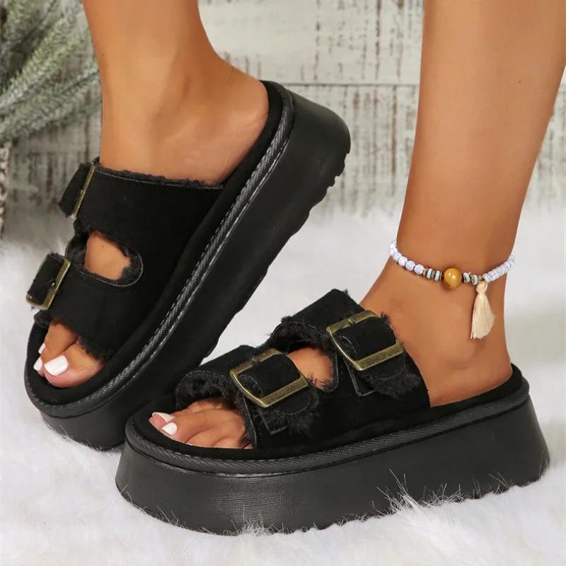 Меховые тапочки женские в британском стиле Римская обувь Удобная мягкая зимняя женская домашняя обувь с металлической пряжкой Повседневные тапочки на платформе Пушистые шлепанцы