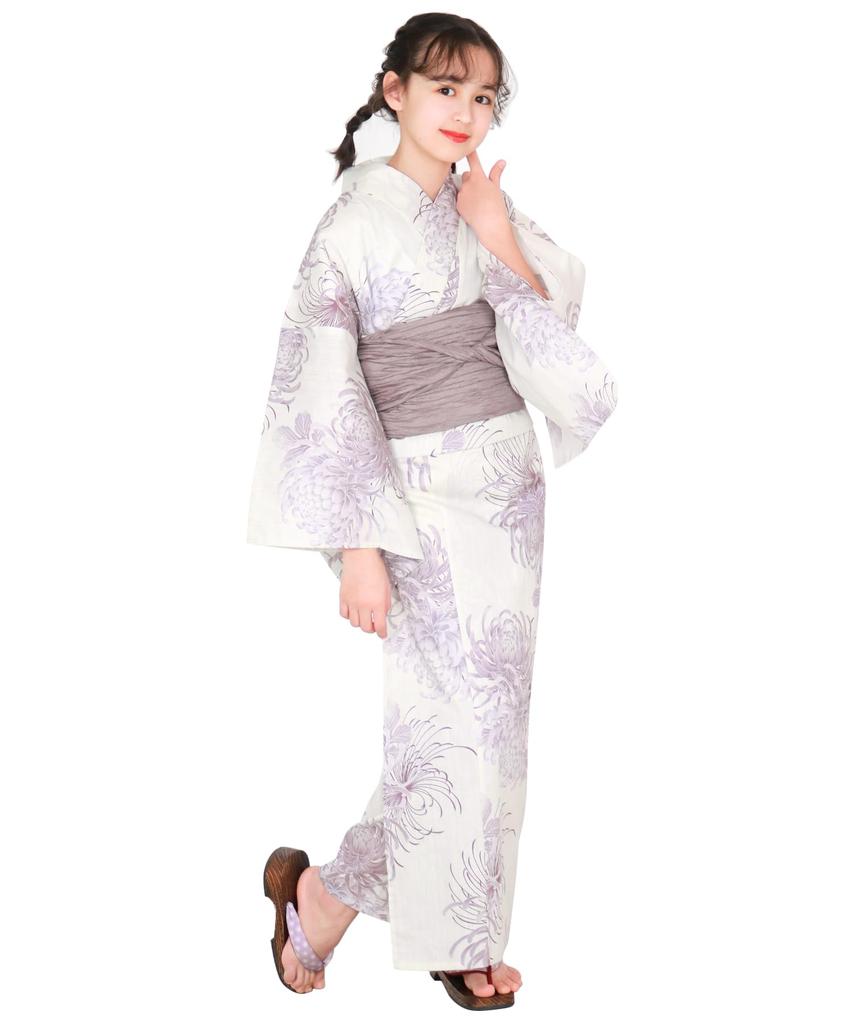 Юката Set for Change 3 Piece Set Heiko Junior Girls H Purple Chrysanthemum [KYOETSU] Девочки, цвет экрю, плетение, (Юката, Оби, Гета) (2. Дымка, 130см)