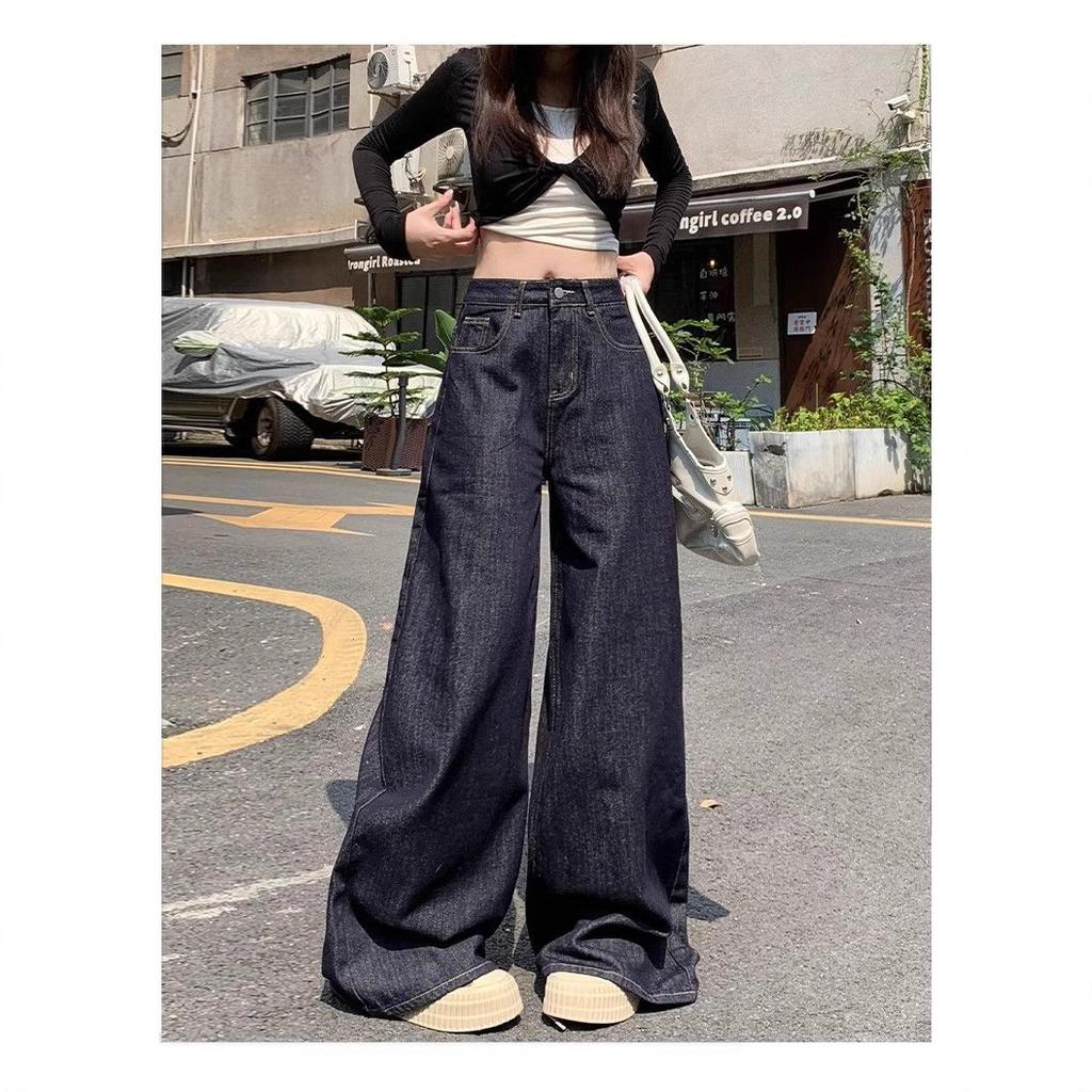 Темно-синие американские широкие джинсы для женщин, новые облегающие прямые брюки с высокой талией и драпировкой
