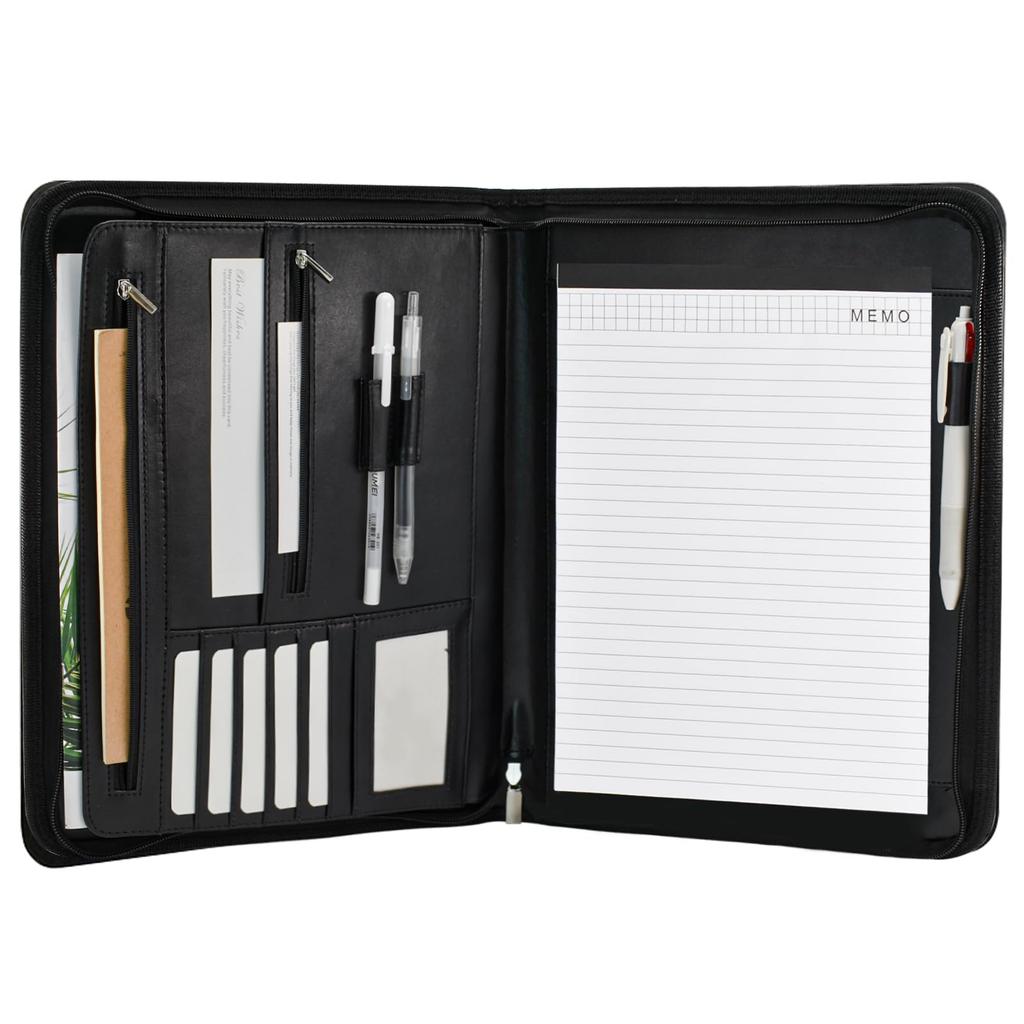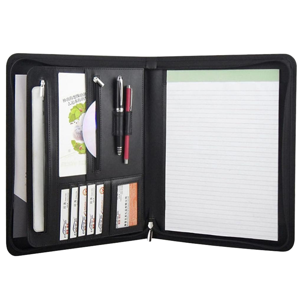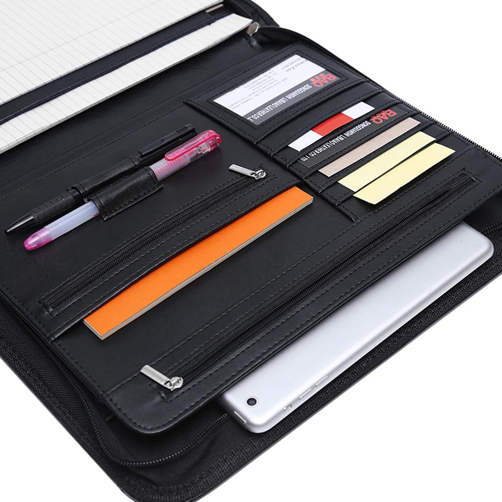 «Высококачественный материал»: Папка Padfolio изготовлена из высококачественной искусственной кожи и прочной ткани, которая долговечна и водонепроницаема, а ее герметичная круглая застежка-молния очень удобна для хранения визиток, документов, планшетов и т. д.