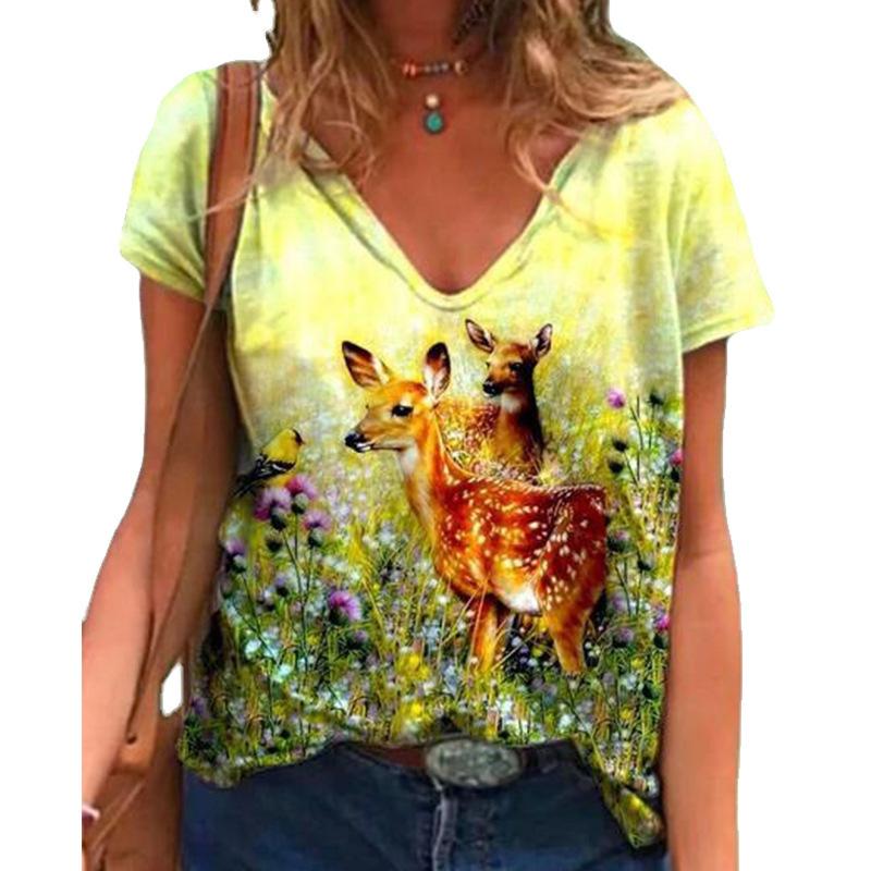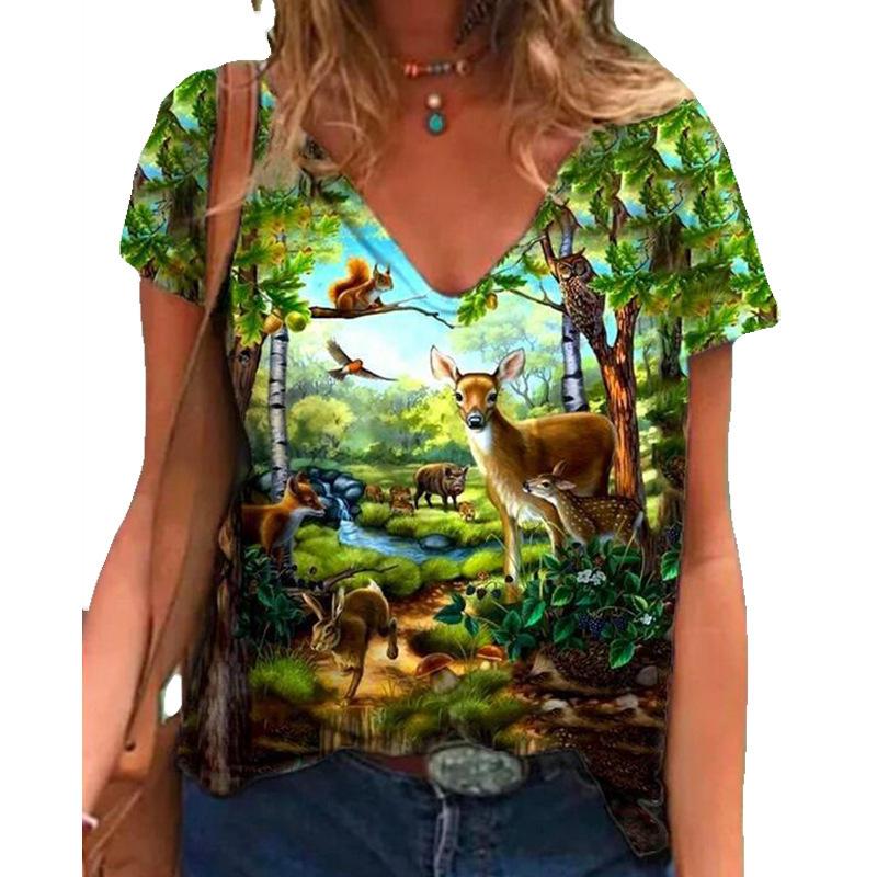 Женская повседневная футболка Топ Новый V-образный вырез Свободный Короткий рукав С цифровой 3D-печатью Футболка