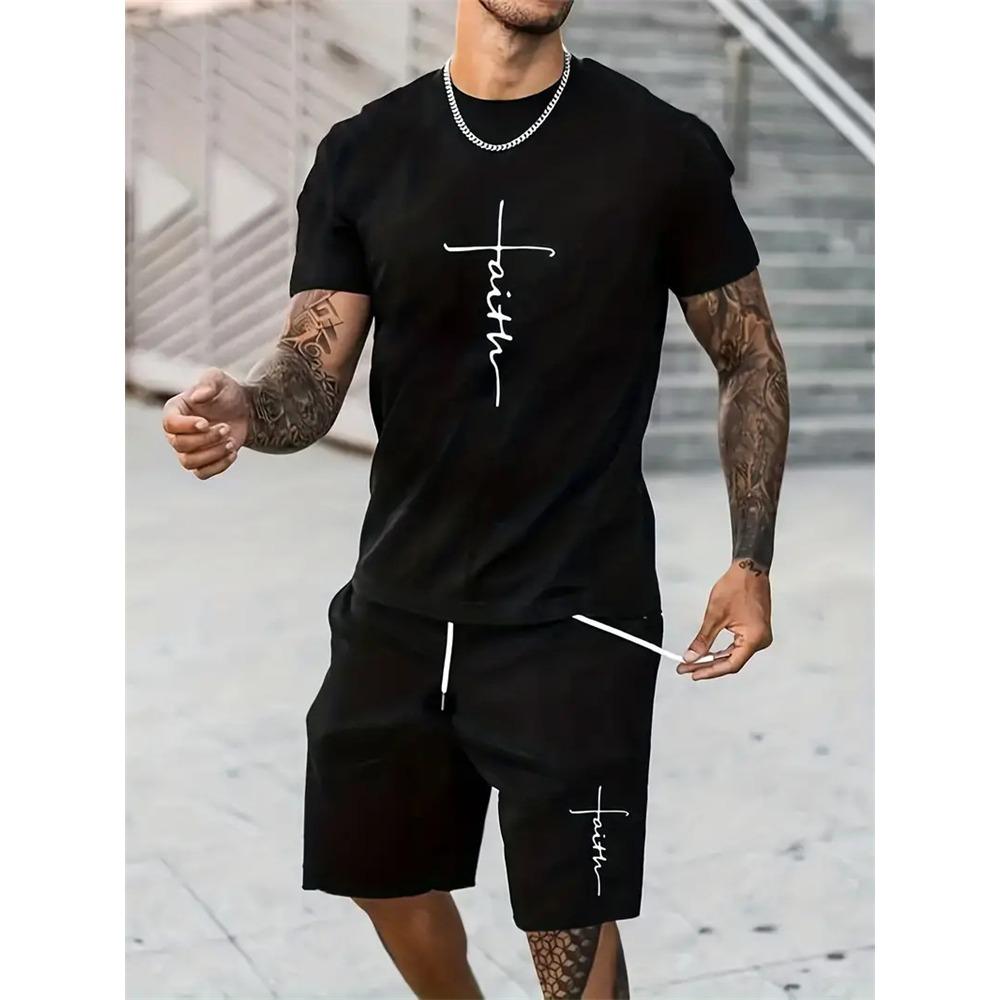 Мужская футболка и шорты, комплект, модный мужской костюм с коротким рукавом и принтом креста, комплект из двух предметов, большой размер, уличный пляжный спортивный мужской костюм больших размеров