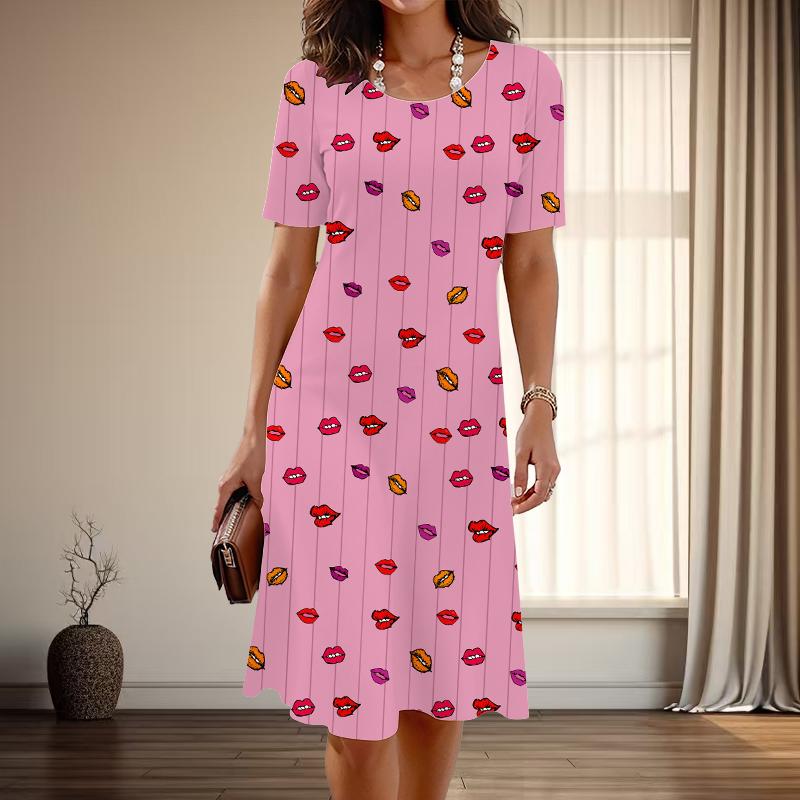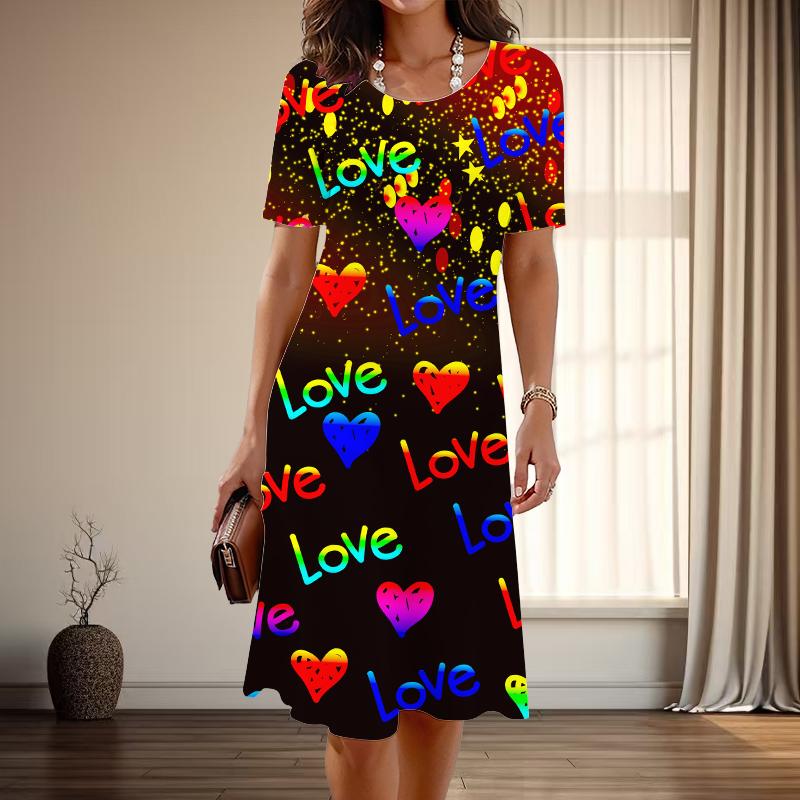 Женская мода изящный любовный принт лето весна короткий рукав О-образный вырез повседневные платья