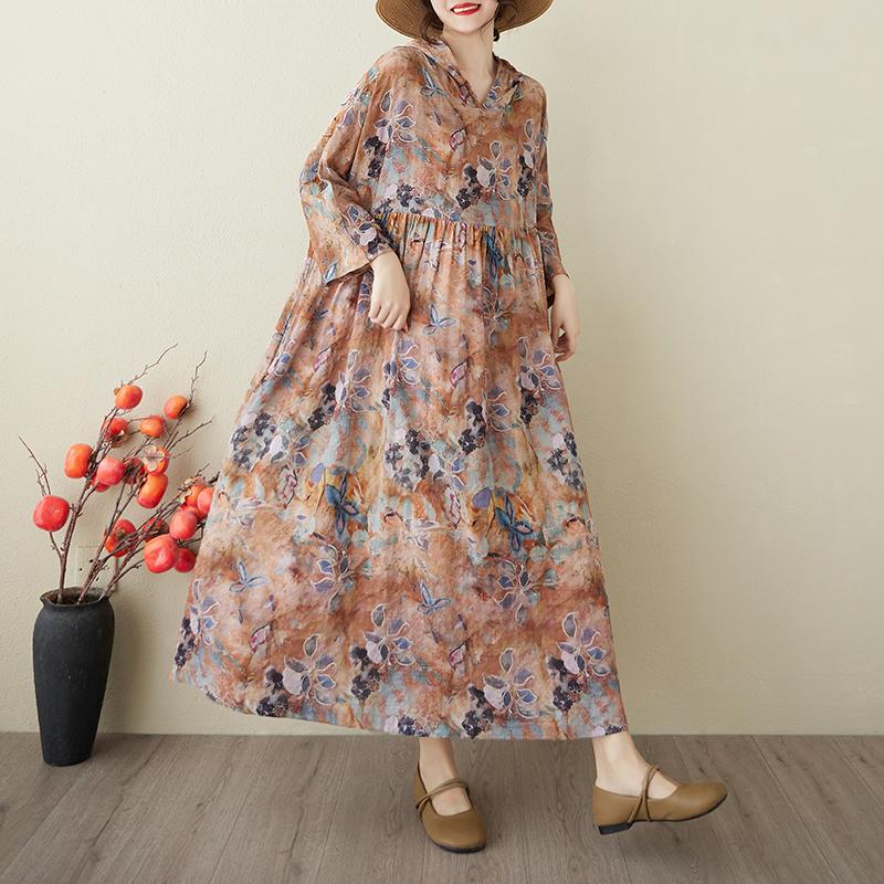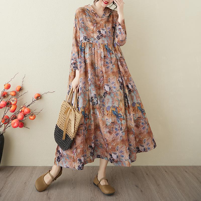 DIMANAF 2025 Лето Женское Плюс Размер Базовое Платье С Капюшоном Плиссированное Повседневное Длинное Свободное Винтажное Цветочное Платье Макси