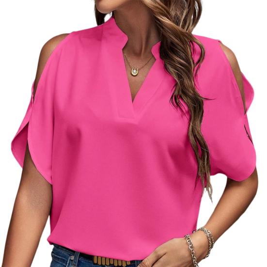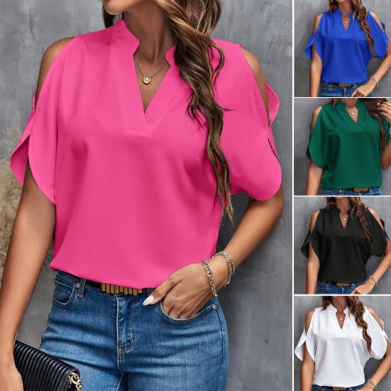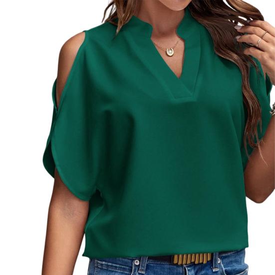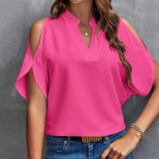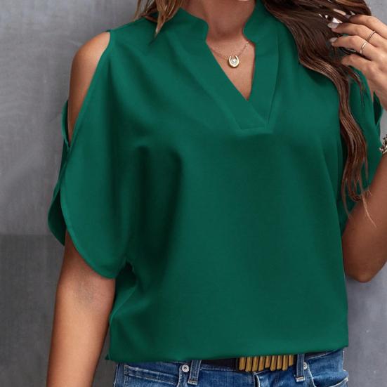 Женская рубашка имеет уникальный однотонный дизайн, V-образный вырез, рукава с открытыми плечами и короткие рукава.