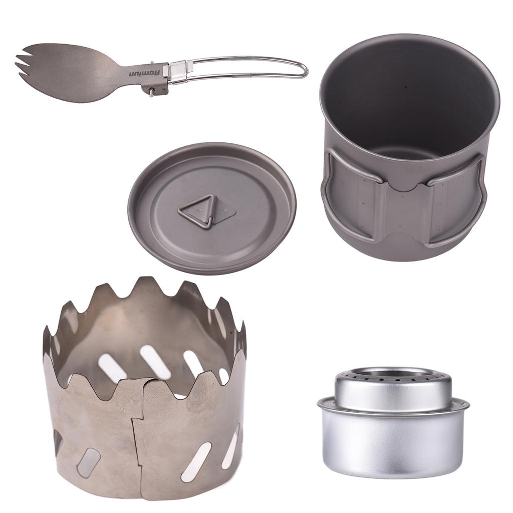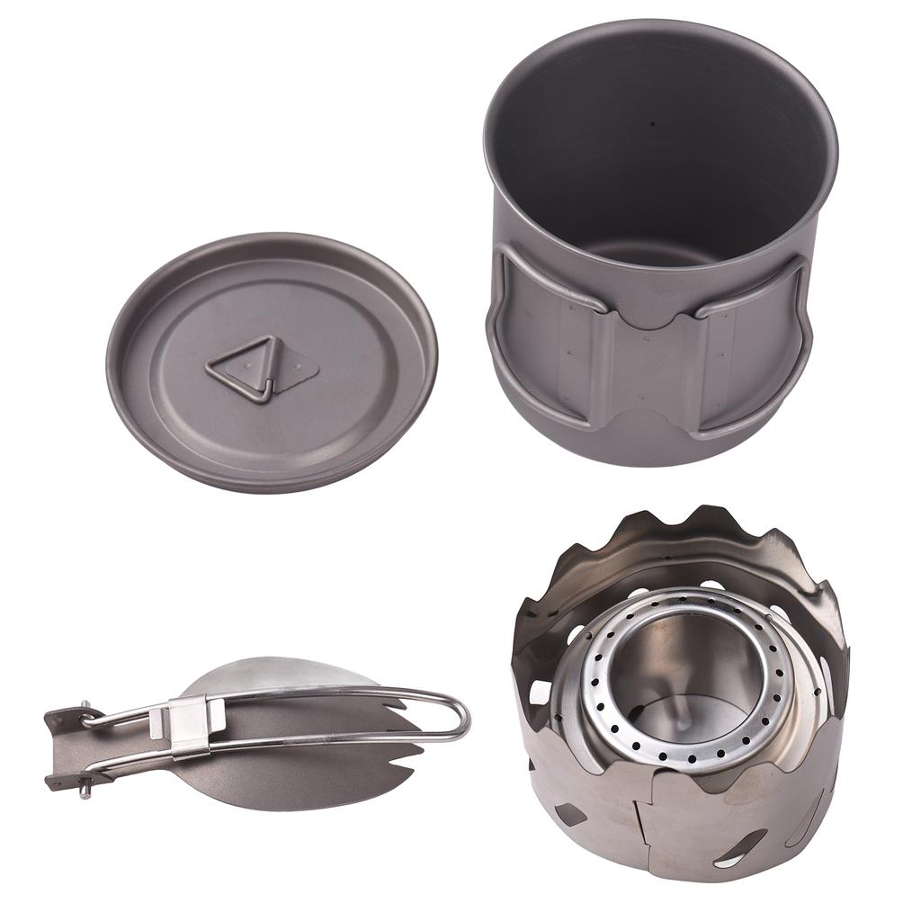 1 x Ti чашка 500 мл с крышкой1 x Ti вилка и ложка1 x алюминиевая спиртовка1 x ветрозащитный экран из нержавеющей стали