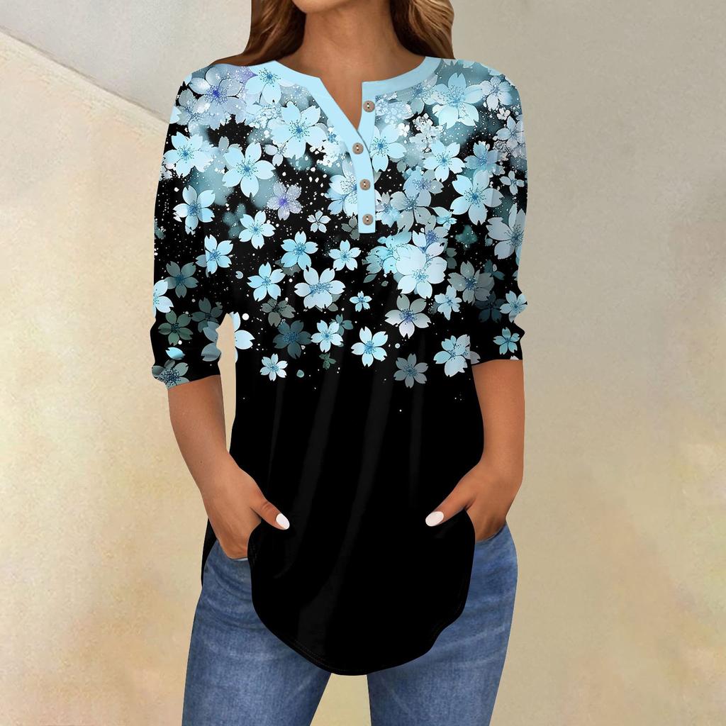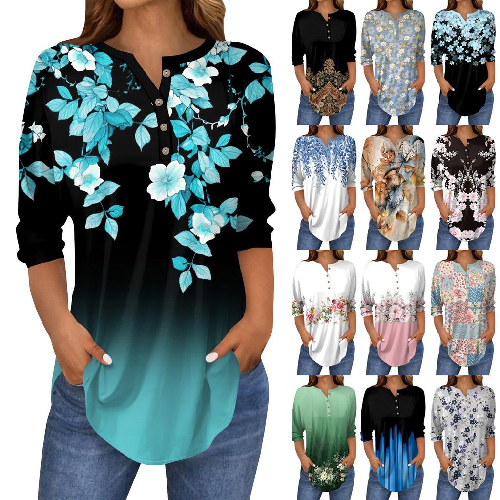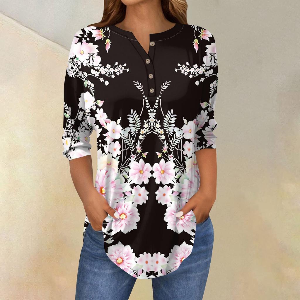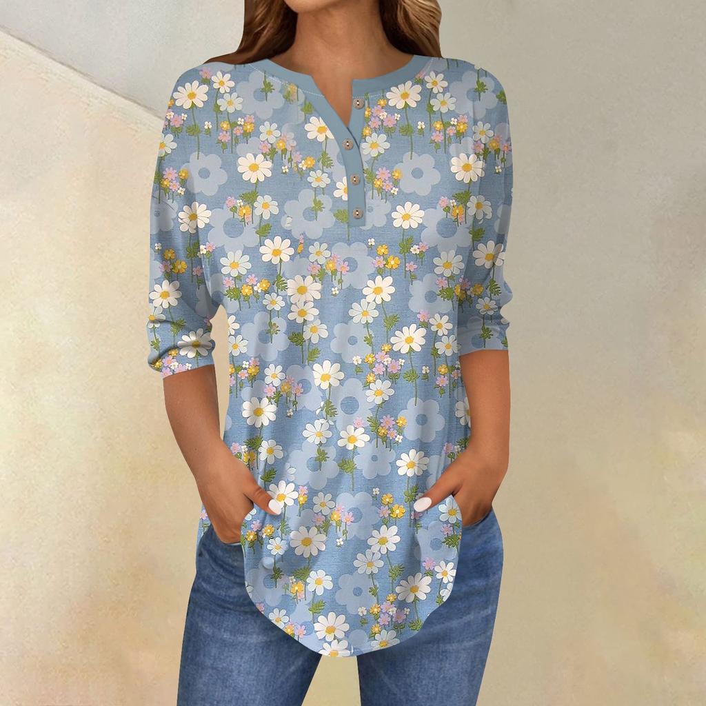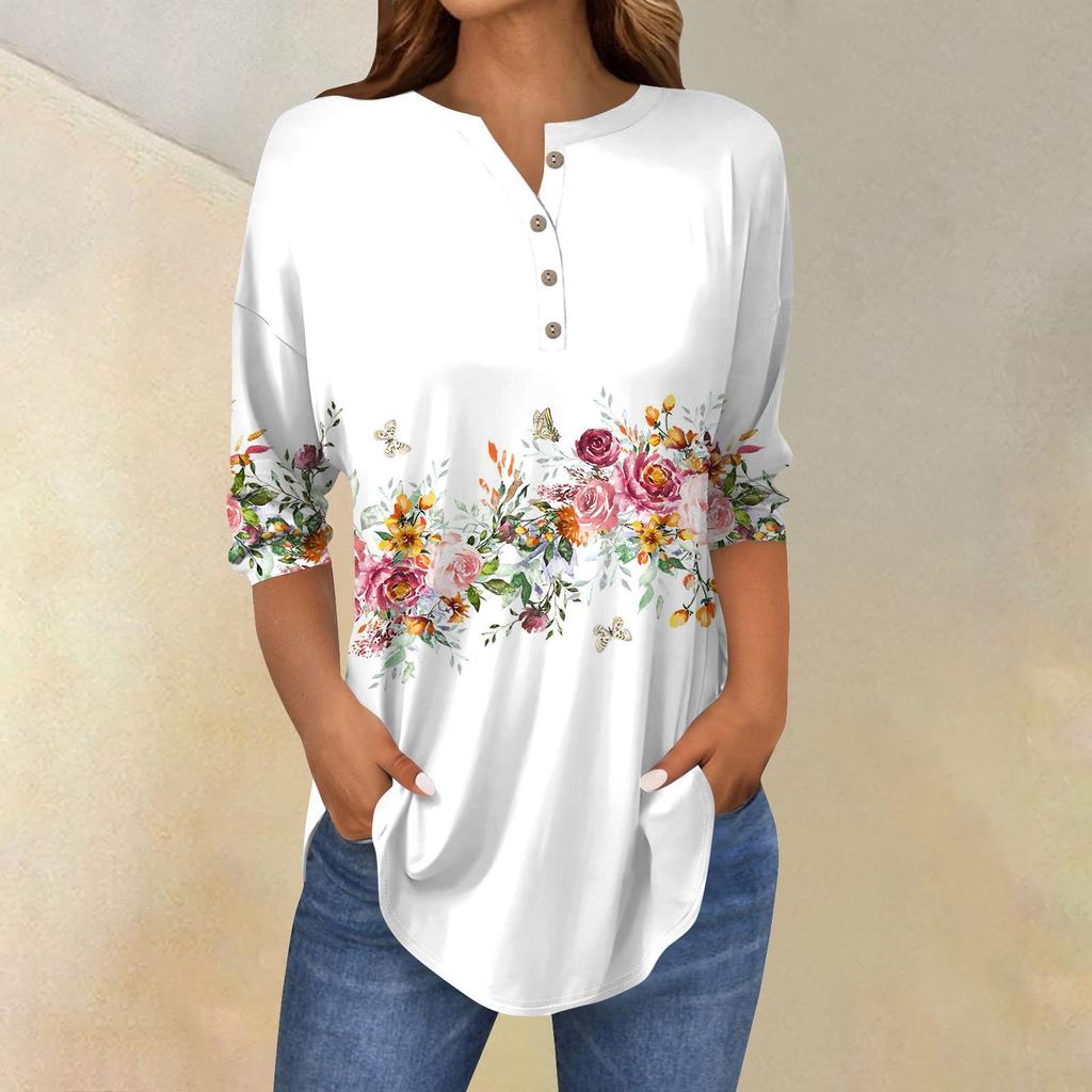 Женские топы с рукавами 3/4, летние футболки с цветочным принтом и V-образным вырезом, повседневные базовые футболки с пуговицами, туники