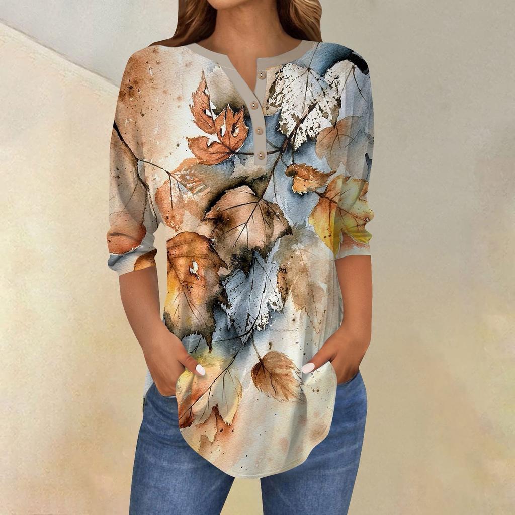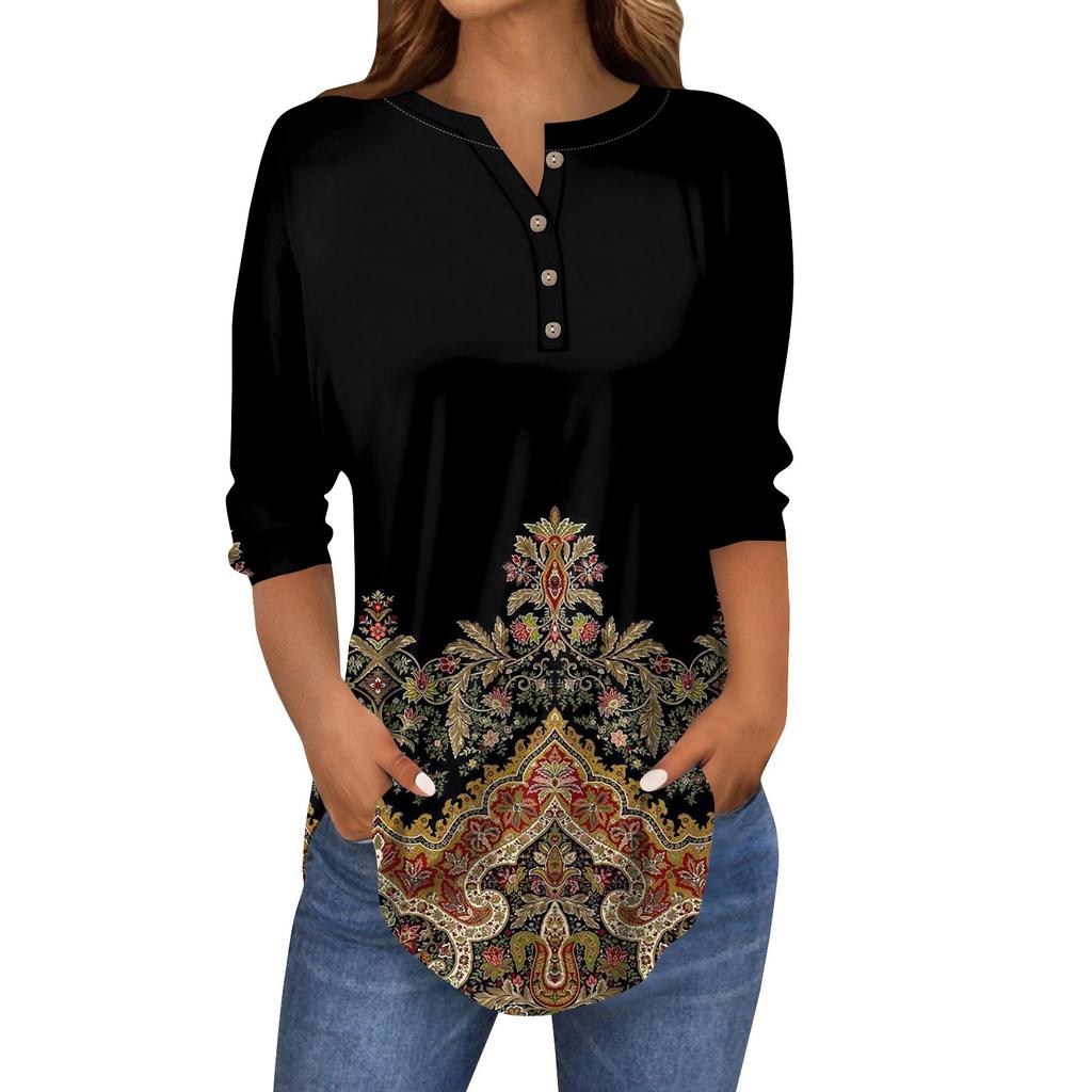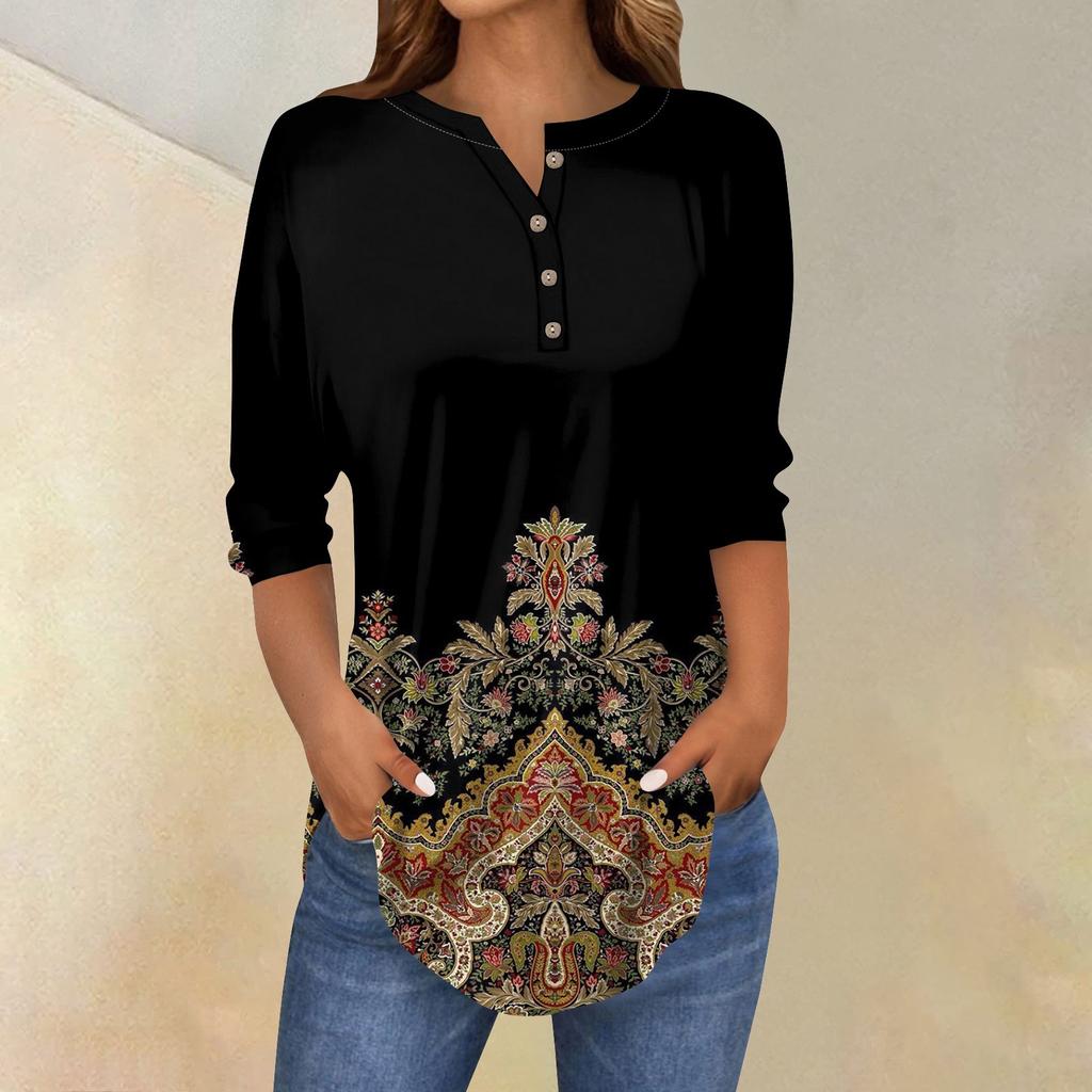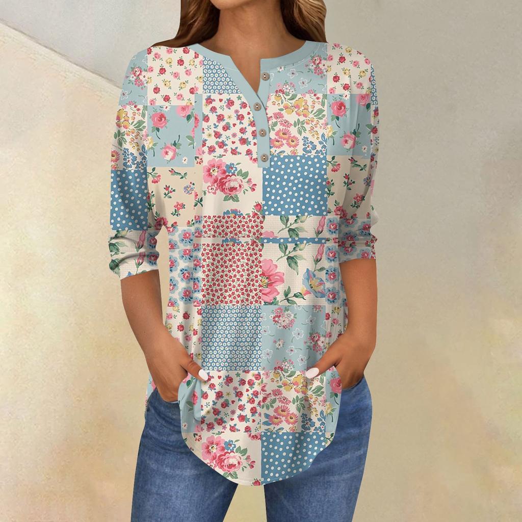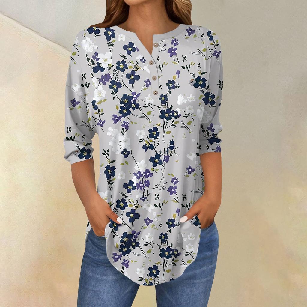 Женские топы с рукавами 3/4, летние футболки с цветочным принтом и V-образным вырезом, повседневные базовые футболки с пуговицами, туники