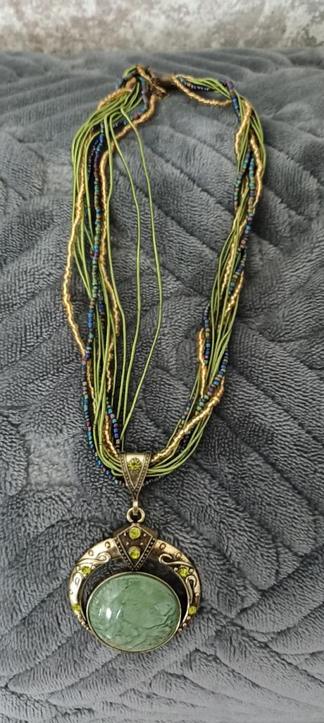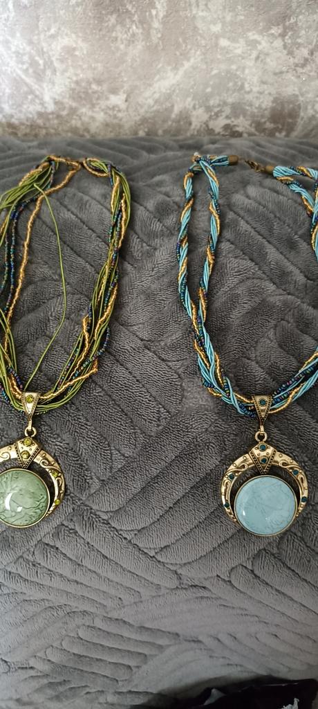 Очень, очень понравилось ожерелье. На мой вкус оно просто идеальное по визуалу. Металлическое обрамление, пластиковая вставка под камень. Рисунок и цвет "камня" отличается от фото, но ничуть не хуже. Немного неаккуратно прикреплена с изнаночной стороны, но снаружи этого не видно. Смотрится гораздо дороже, чем стоит в реальности. Было бы 50 звезд в оценке - я бы их поставила.