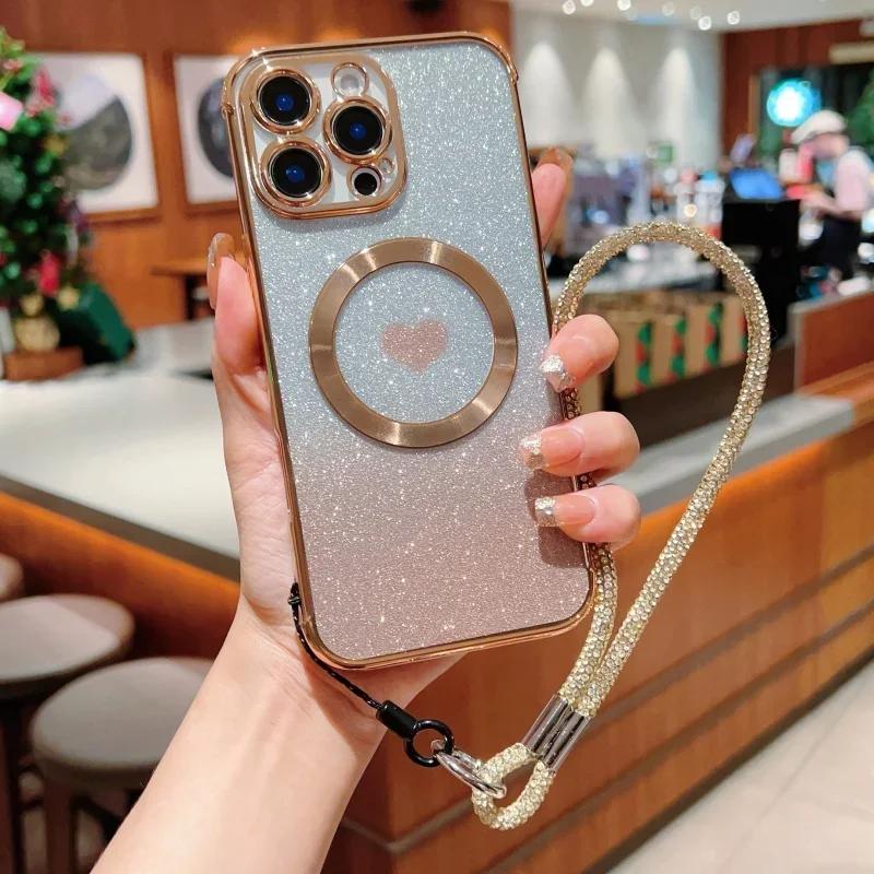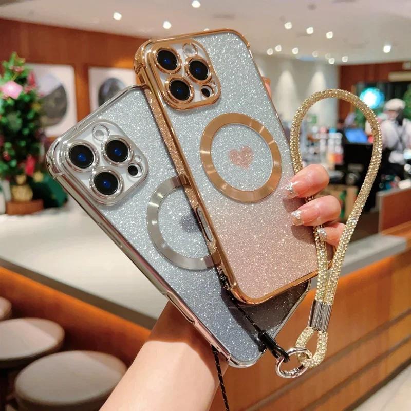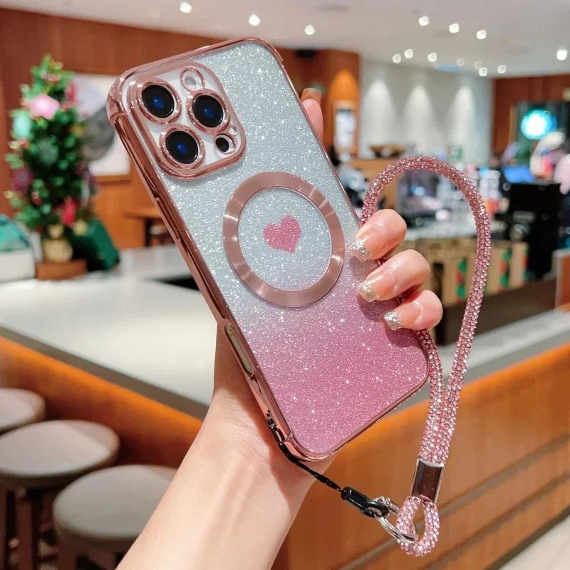 Чехол для телефона с магнитным ремешком на запястье для iPhone 16, 15, 14 Plus, 13, 12, 11 Pro Max, защитный чехол с блестками и градиентом Love