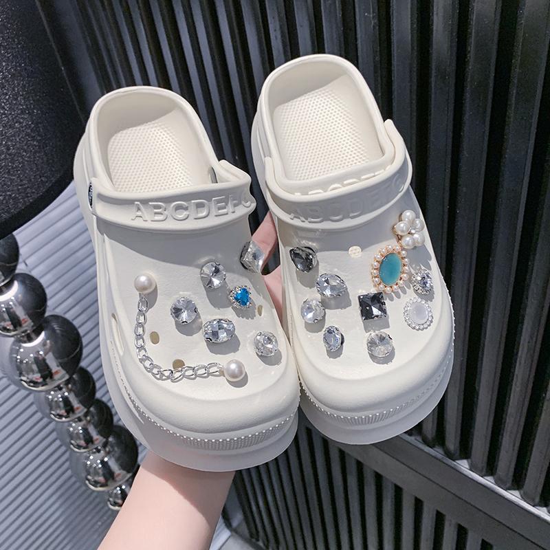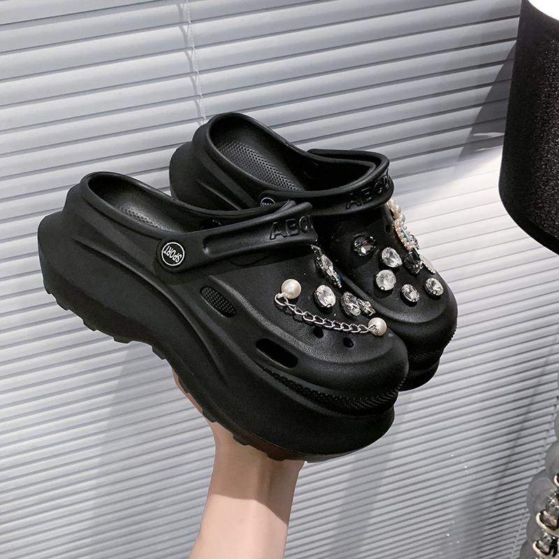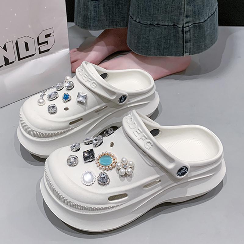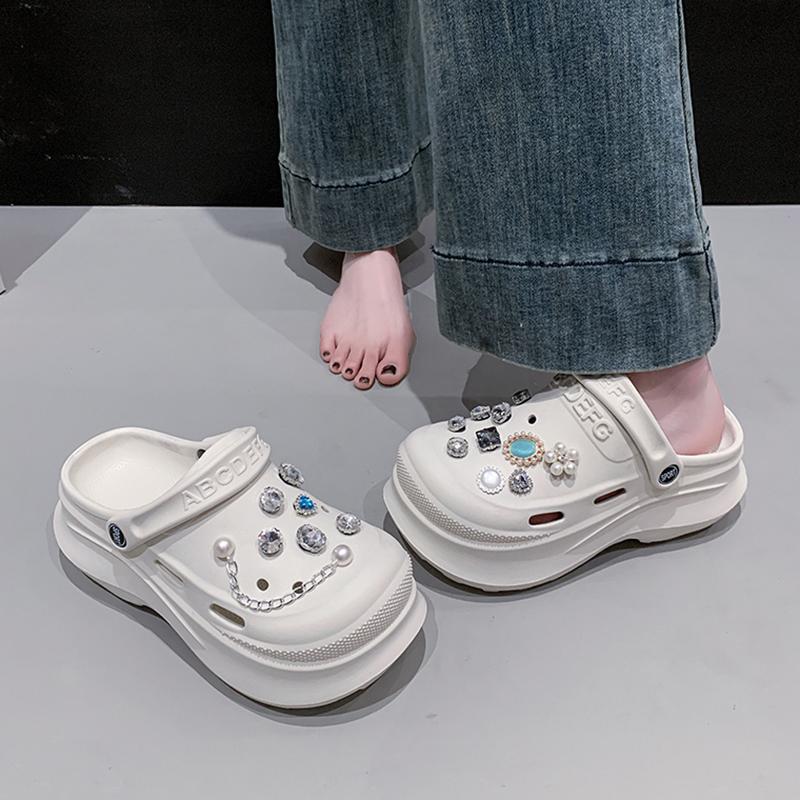 Сандалии на толстой платформе с жемчугом и стразами для женщин, закрытый носок, толстая подошва, пляжные тапочки, женские летние нескользящие садовые сабо из ЭВА