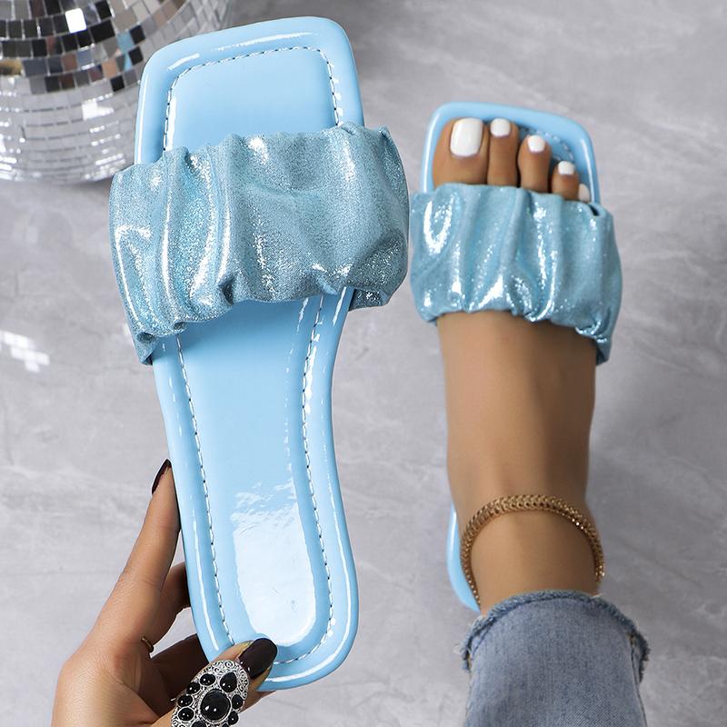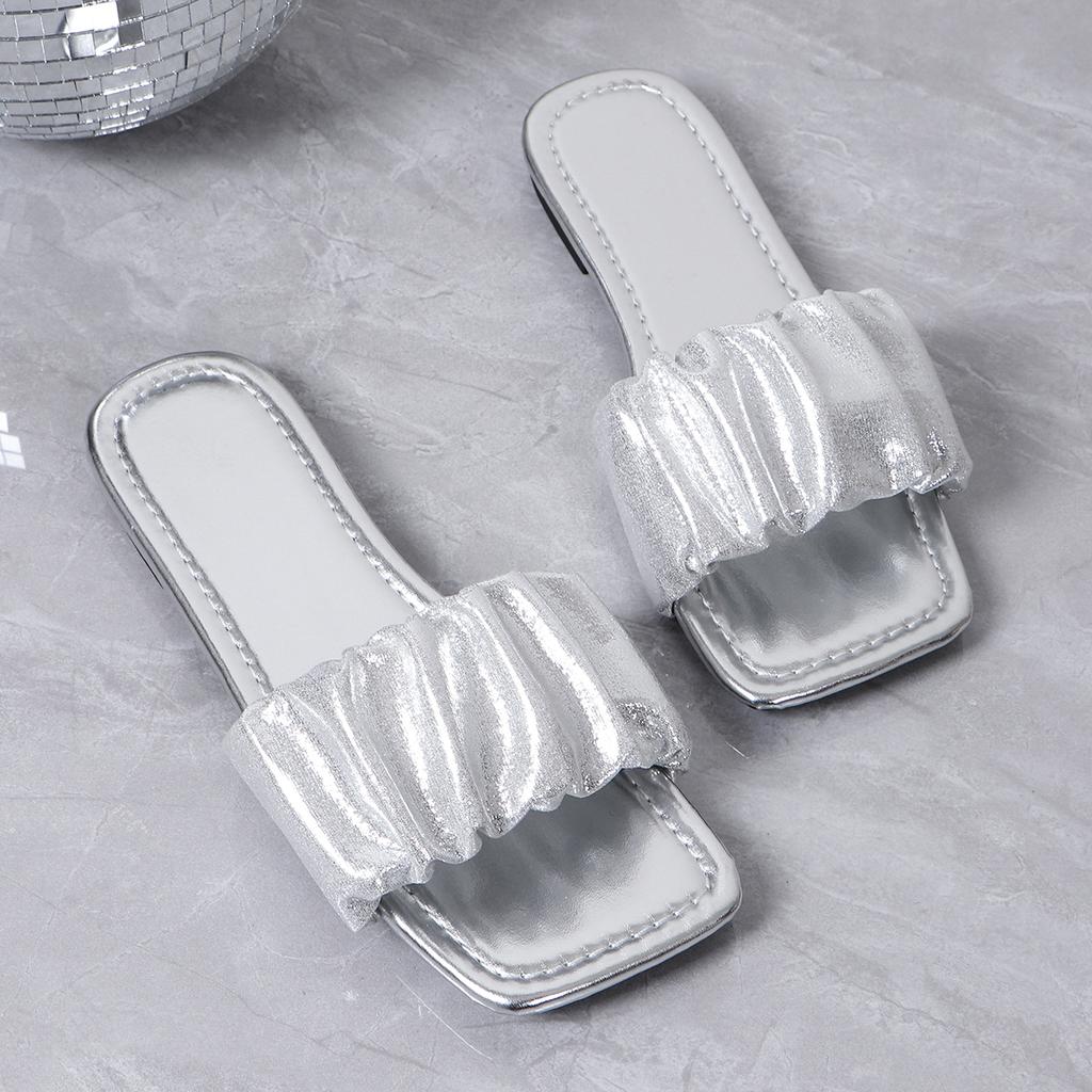Модные плиссированные летние тапочки для женщин 2025 года, новые сандалии на плоской подошве с квадратным носком, женские повседневные однотонные нескользящие пляжные шлепанцы